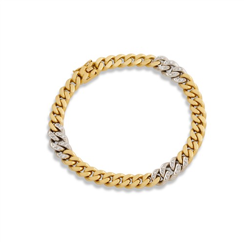 Modelled as a series of curblinks, interspersed with links pavé-set with brilliant-cut diamonds, the diamonds together weighing approximately 0.33 carats, completed by a concealed box clasp, length 195mm, gross weight approximately 35.9 grams.