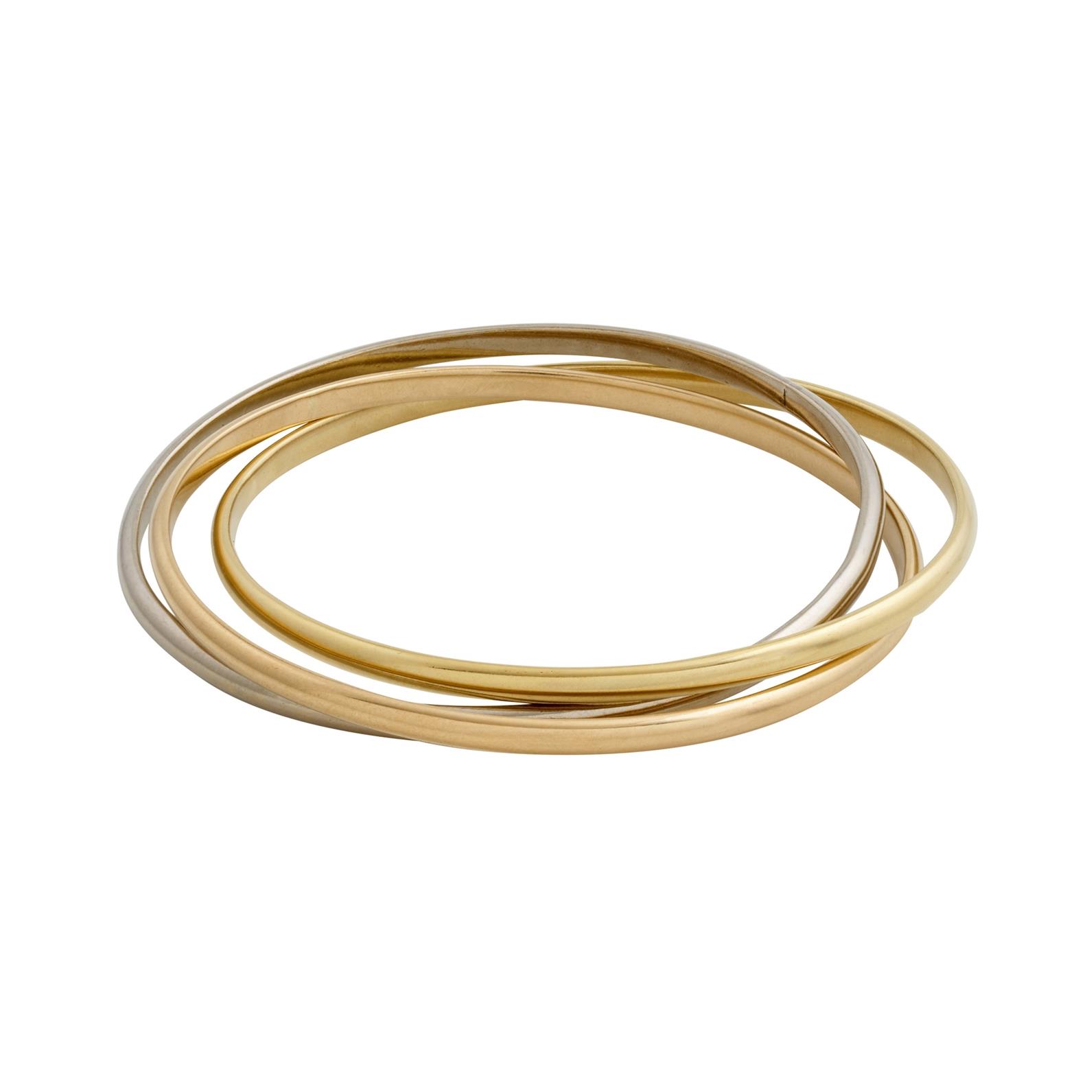 Comprising of interlocking yellow, white and rose gold bangles, two mounted in 18ct rose and yellow gold, one in 5ct white gold, inner circumference 220mm, gross weight approximately 64.6 grams.