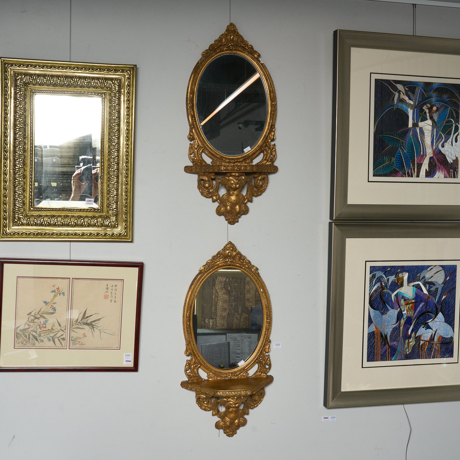 A PAIR OF MID 19TH CENTURY AUSTRALIAN GILDED WOODEN CARVED CHERUB AND FERN DECORATED MIRROR WALL SHELVES, WITH PAPER MAKERS LABELS TO REAR (A/F) H.70CM