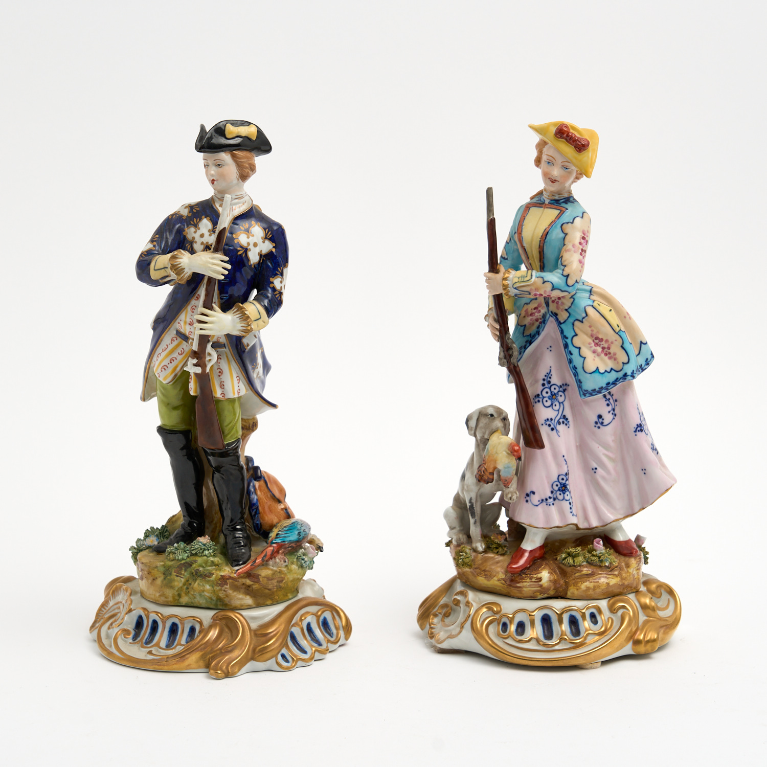 A PAIR OF MID 20TH CENTURY ITALIAN PORCELAIN HAND PAINTED HUNTING FIGURES (A/F) H.29CM