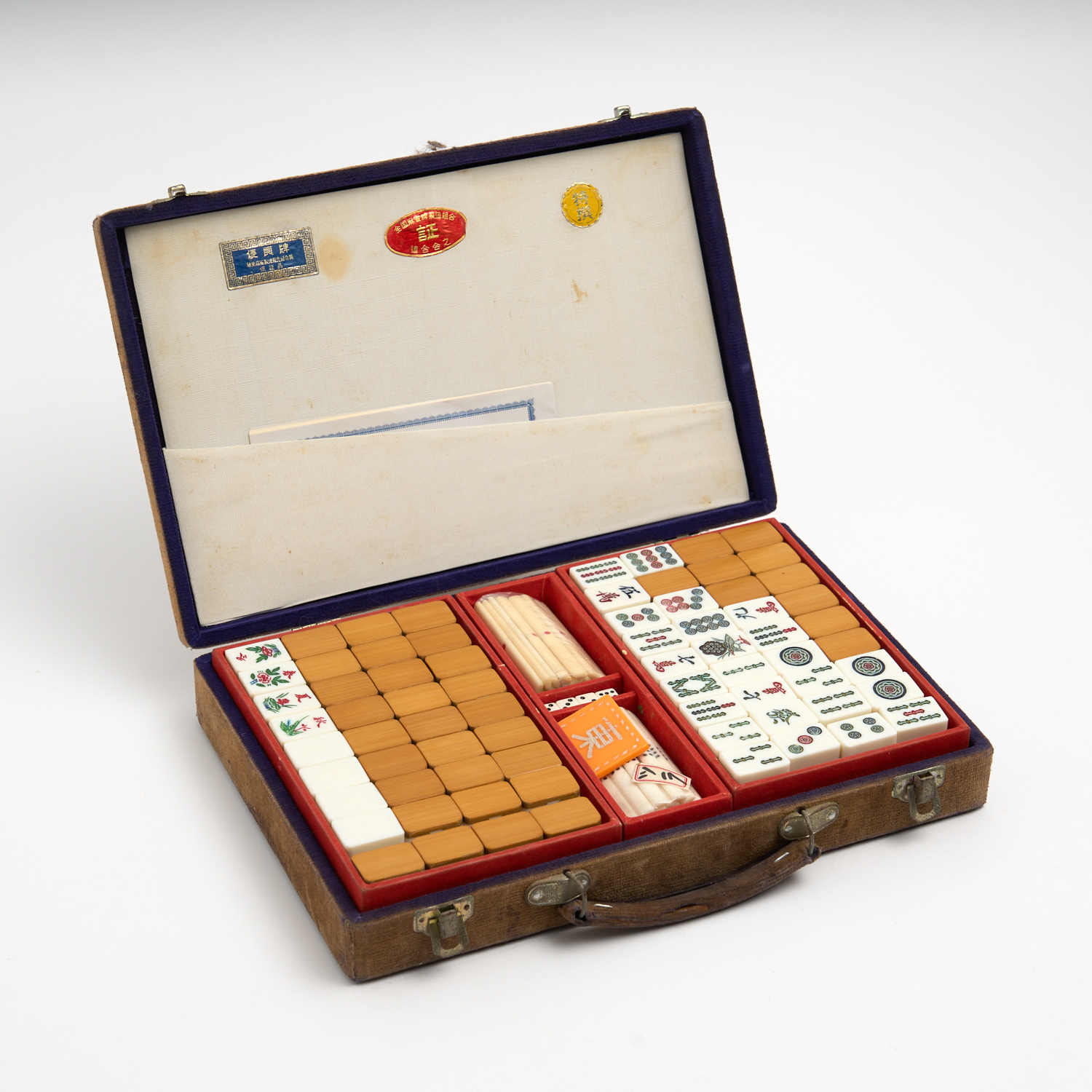 A VINTAGE VELVET CASED BAMBOO AND BAKELITE MAHJONG SET