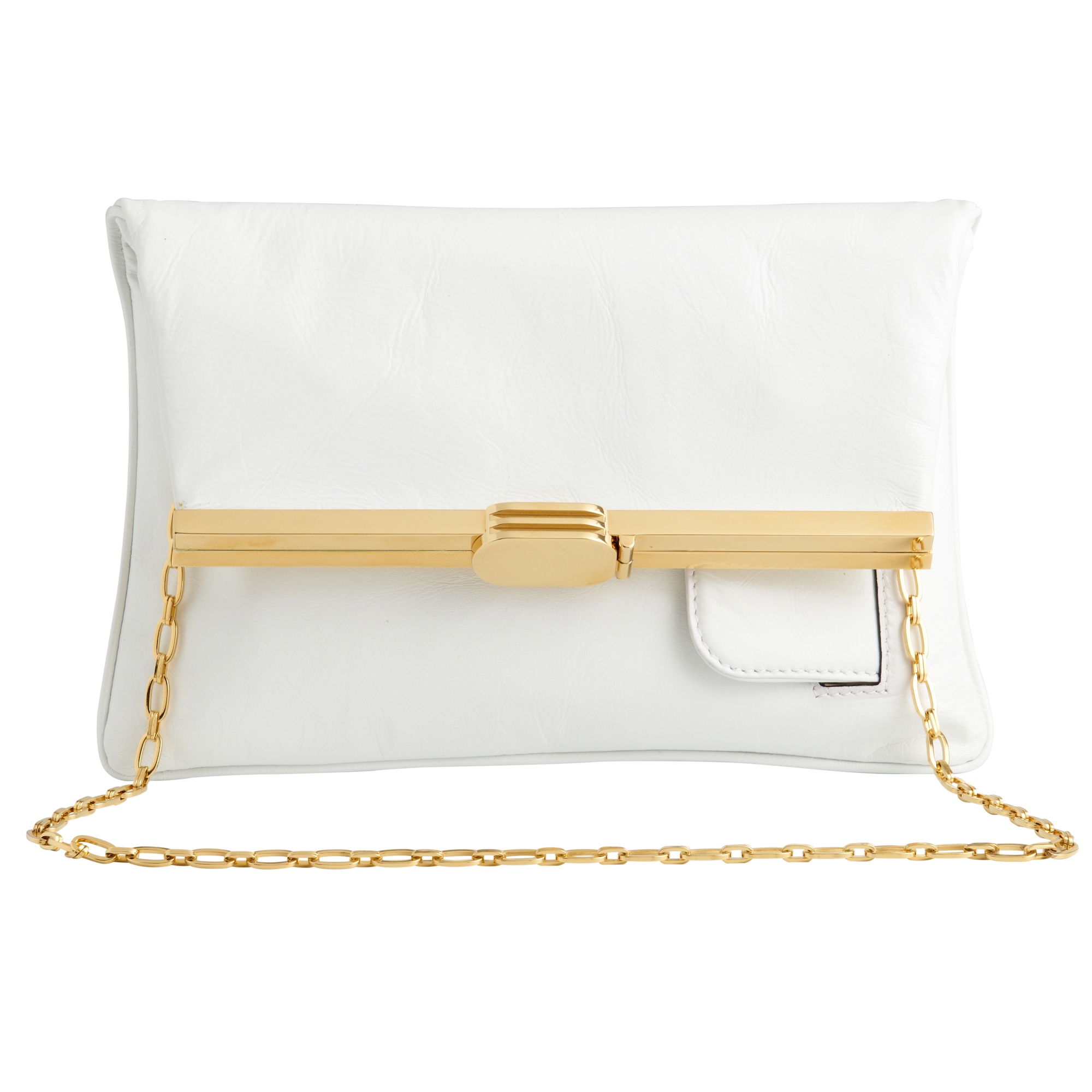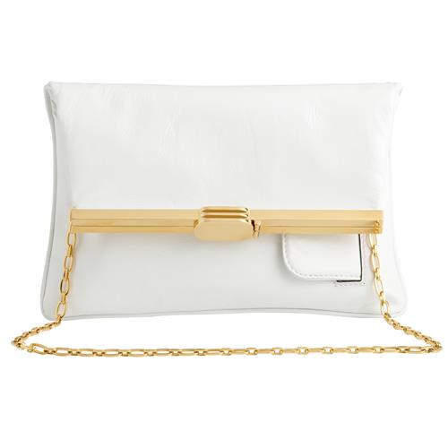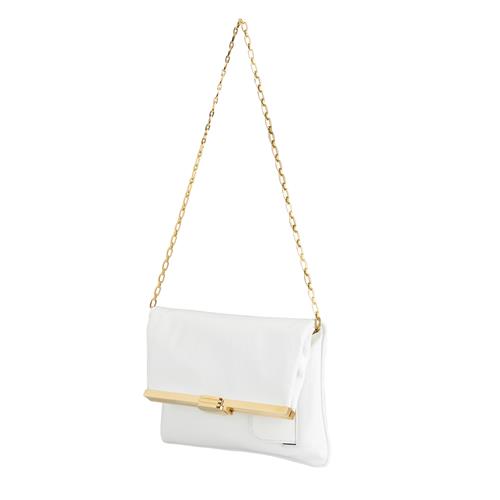 Styled in white leather with gold tone hardware, featuring multiple pockets and chain strap details, measures 23 x 15 x 1 cm.