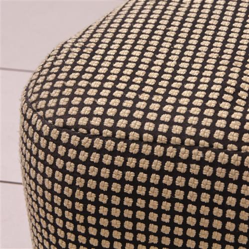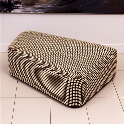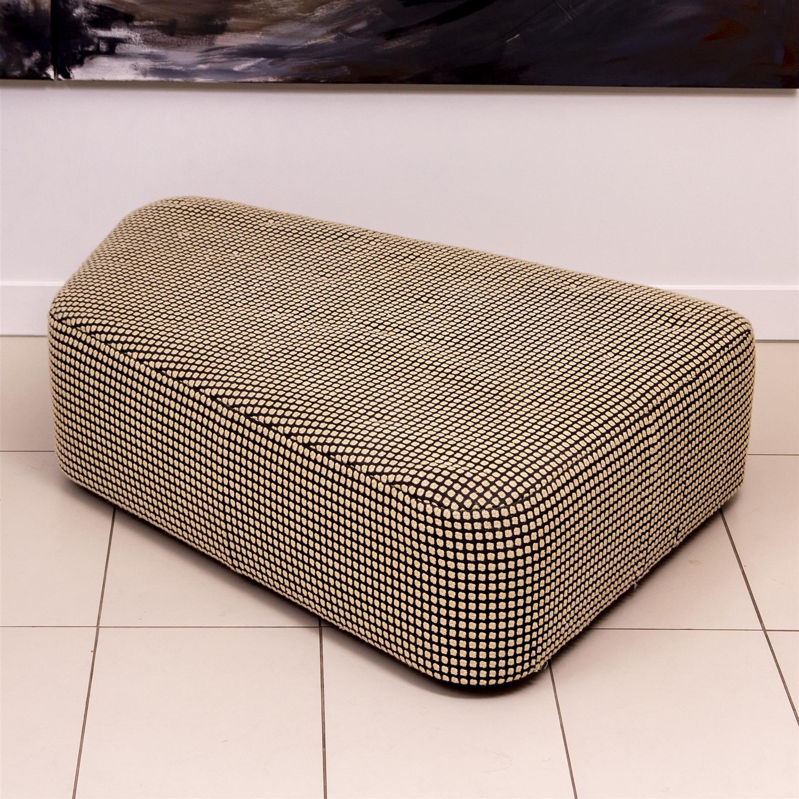 The ottoman upholstered in 'Pied-de-Poule' fabric features a soft sculptural design, fitted with four wheels to the base.