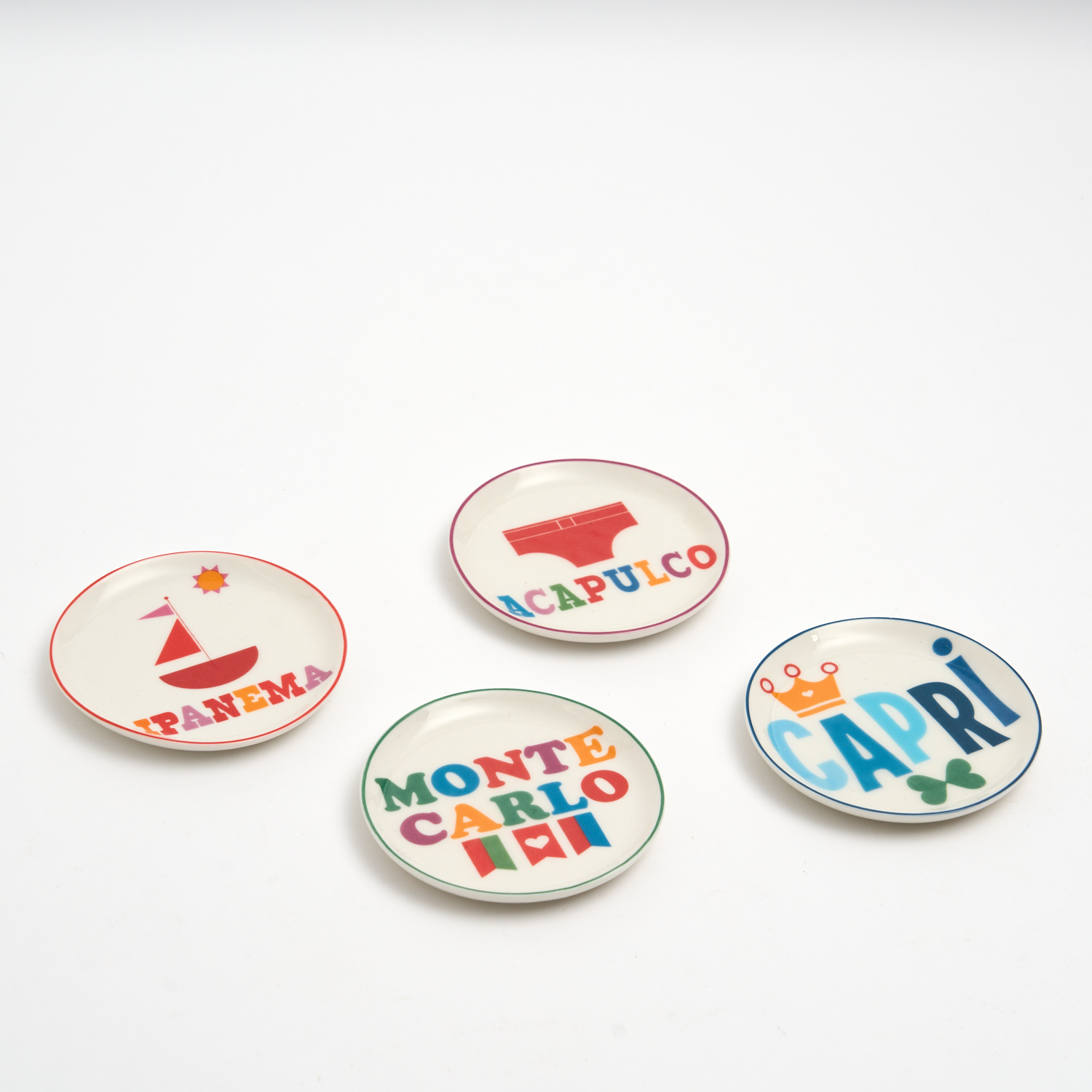 A SET OF CERAMIC 'STAYCATION' COASTERS BY JONATHAN ADLER