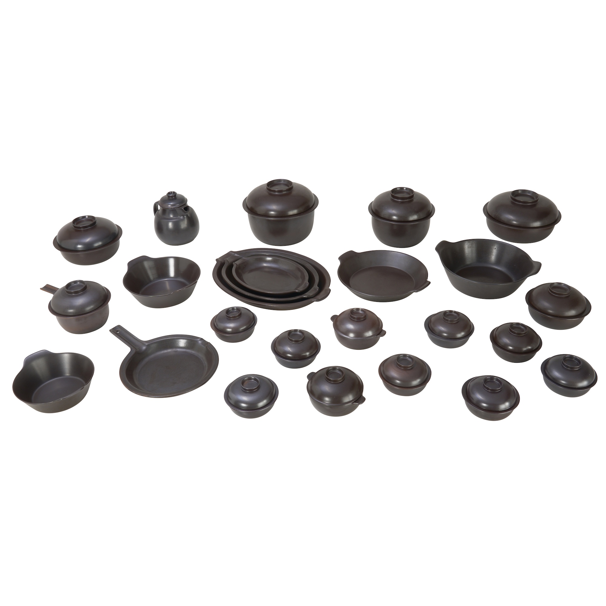 Stoneware with matte brown lustre glaze. Manufacturer stamps to bases.