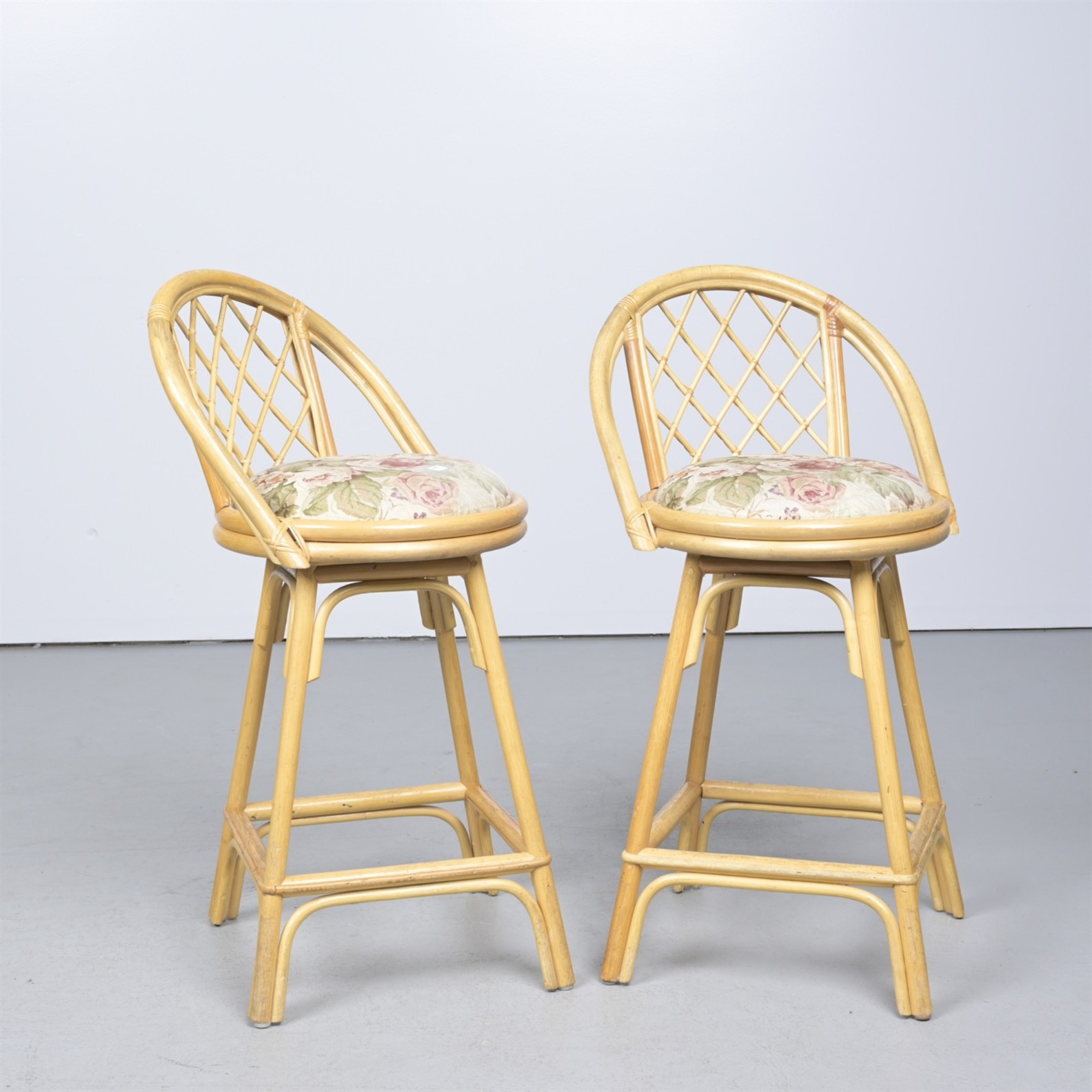 A PAIR OF CANE AND UPHOLSTERED SWIVELLING BAR STOOLS (95CM H X 48CM W X 46CM D)
