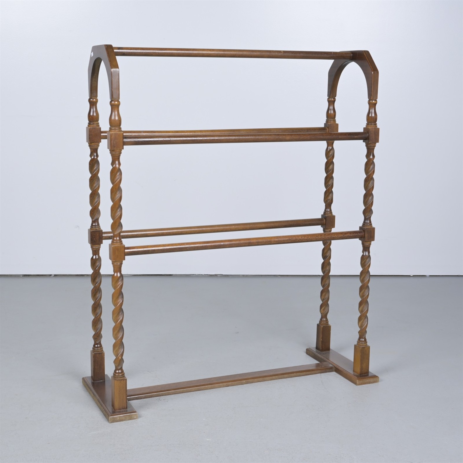 A LARGE ANTIQUE-STYLE HARDWOOD TOWEL RAIL (121CM H X 95CM W X 40CM D)