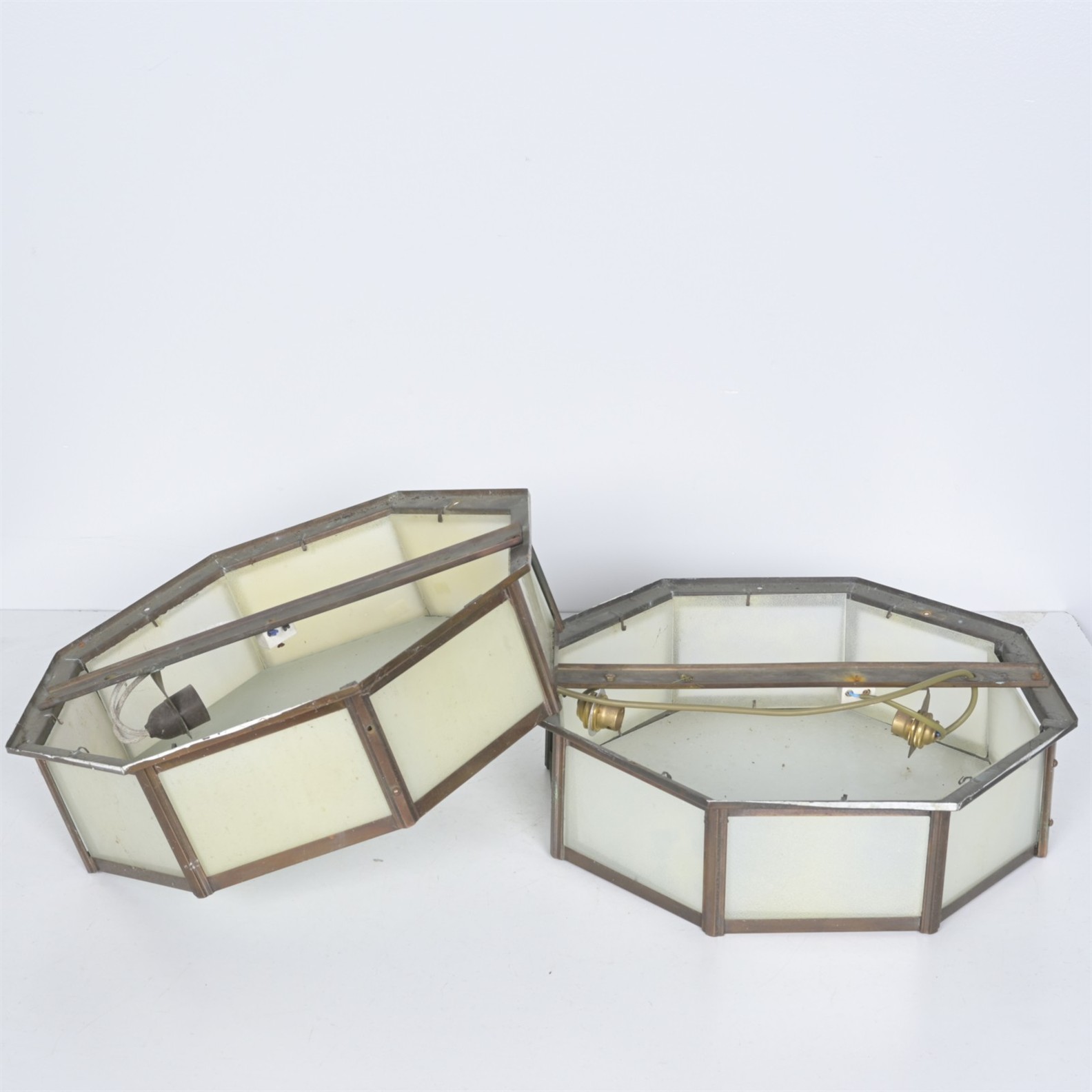 A PAIR OF ART DECO GLASS AND COPPER CEILING LIGHTS (A/F) (14H X 45W X 45D CM)