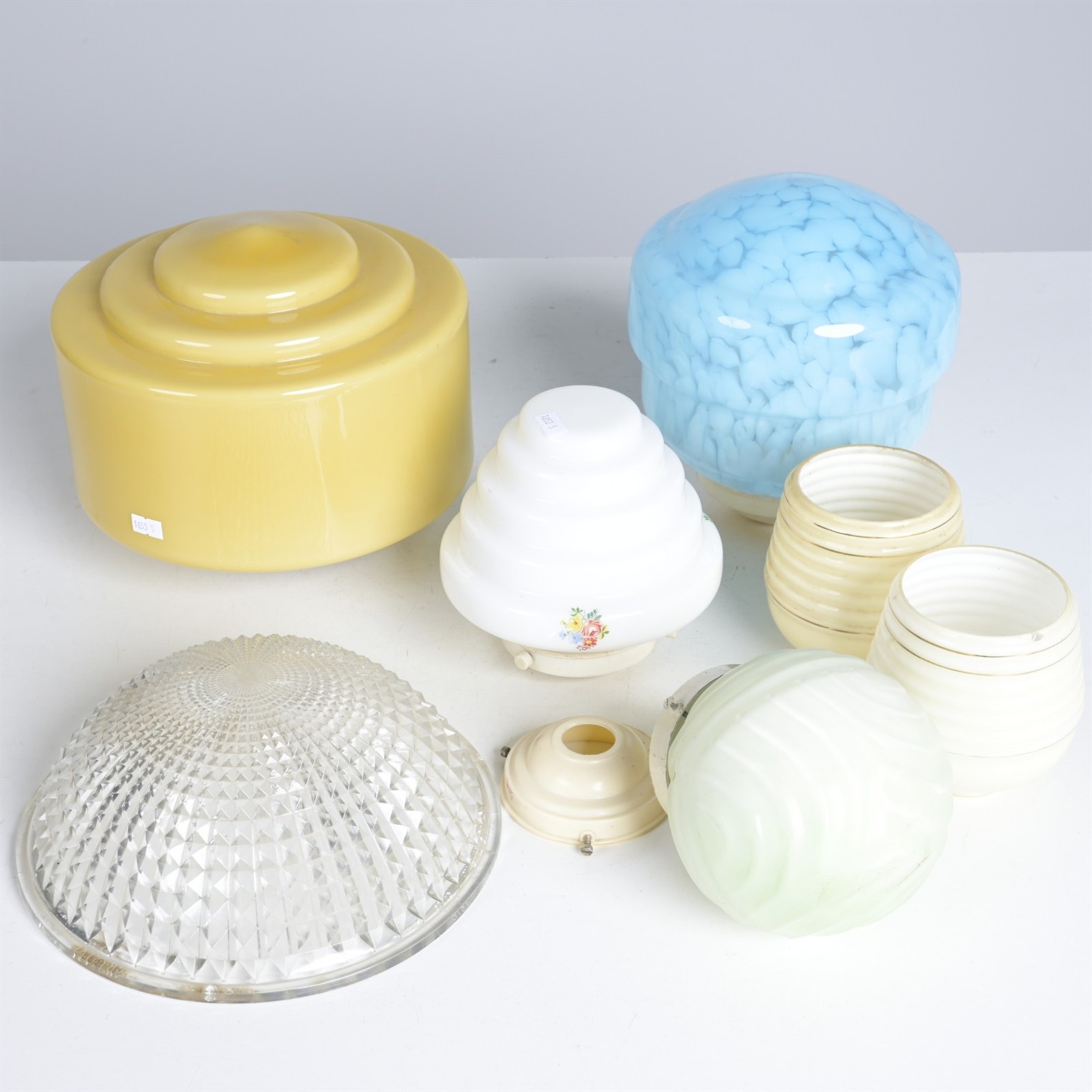 A GROUP OF SEVEN ART DECO GLASS CEILING SHADES (A/F) (BLUE SHADE MEASURES 23CM H X 20CM DIA )