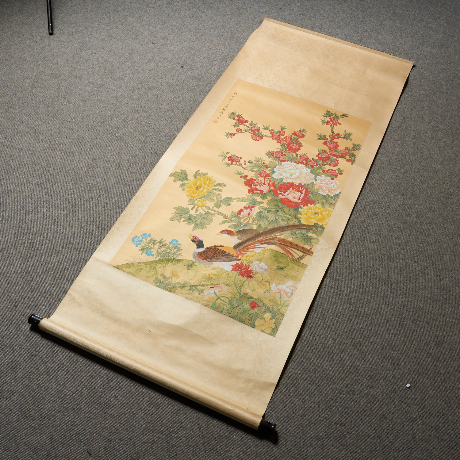 A CHINESE SCROLL DEPICTING FLOWERS AND PHEASANTS