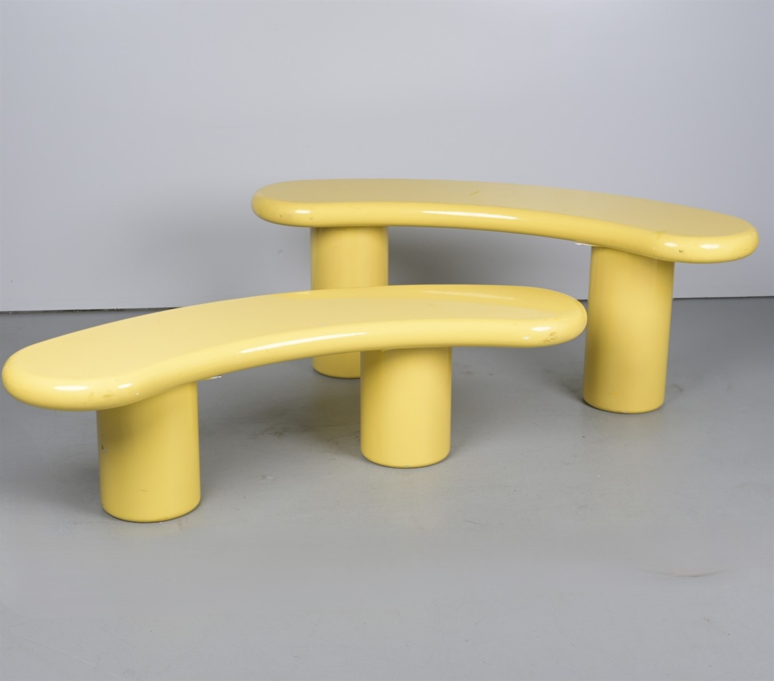 A YELLOW FIBREGLASS BOOMERANG TABLE WITH MATCHED BENCH (A/F) (80H X 200W X 50D CM) (THIS ITEM MUST BE REMOVED BY CARRIERS AT THE CUSTOMER'S EXPENSE. LEONARD JOEL STAFF CANNOT ASSIST CARRYING THIS ITEM.)