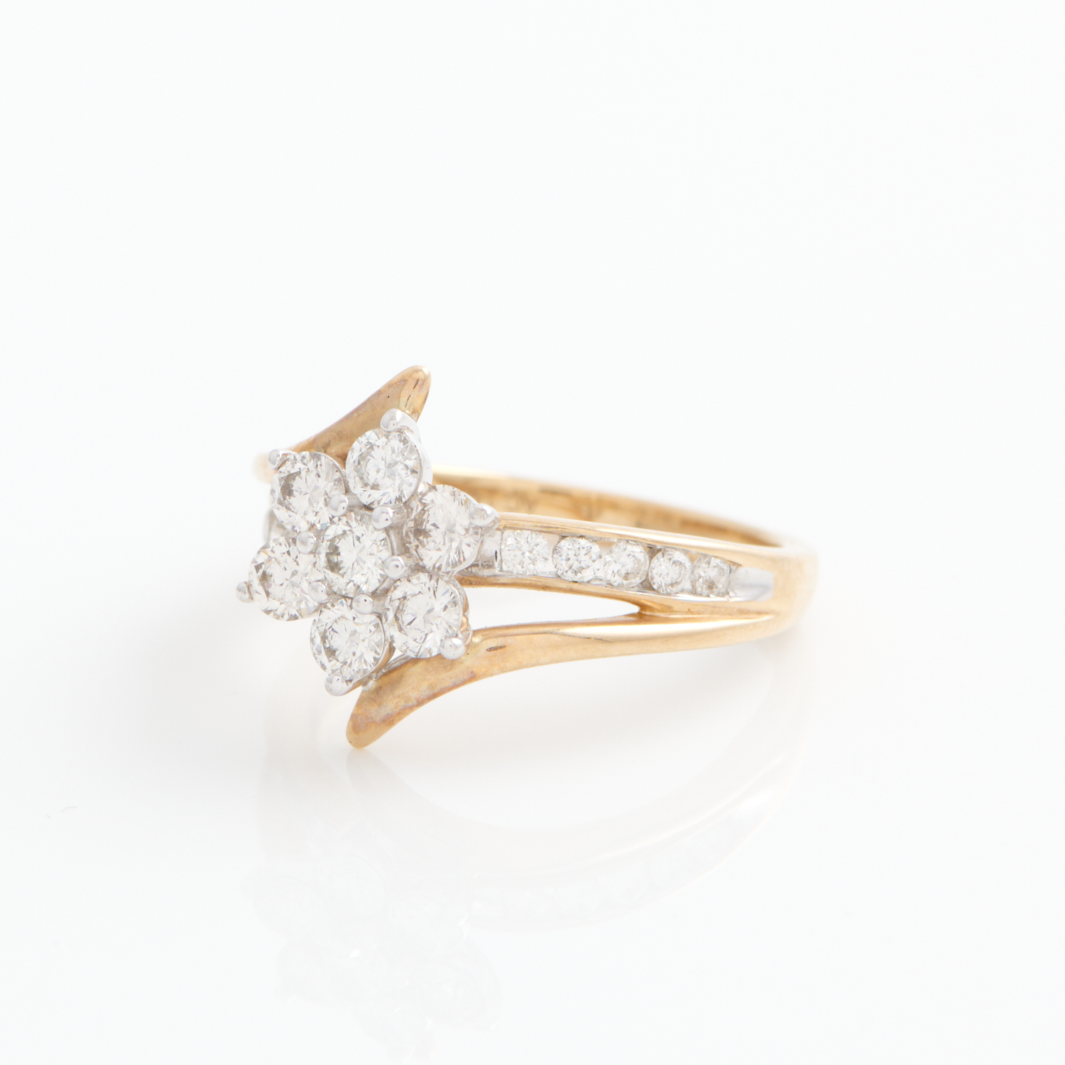 A FLOWER MOTIF DIAMOND RING IN 9CT TWO TONE GOLD, THE DIAMONDS WEIGHING APPROXIMATELY 1.00CT, SIZE O, 3.72GMS, ACCOMPANIED BY A VALUATION