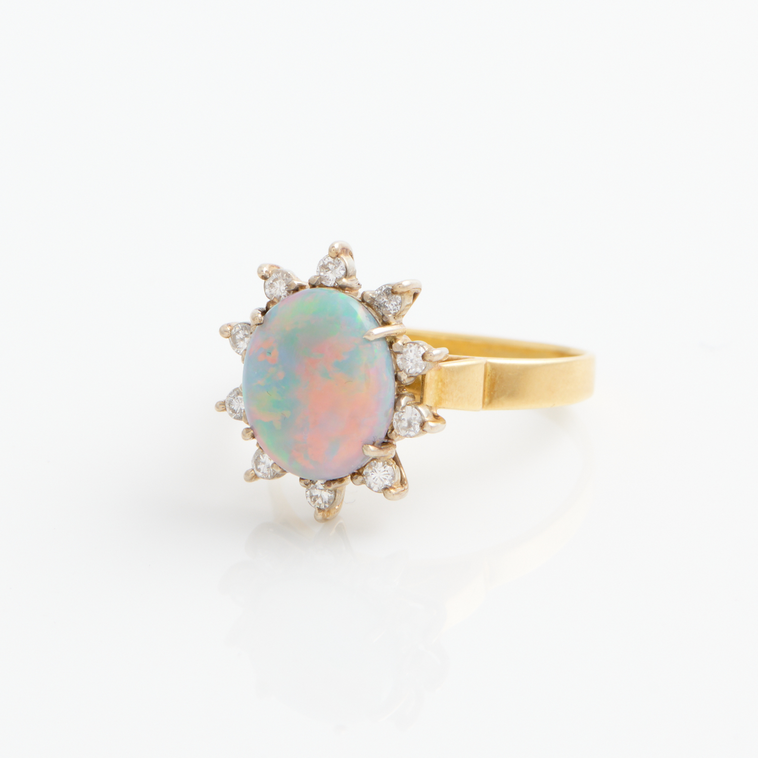 AN OPAL AND DIAMOND RING IN 18CT GOLD, THE OPAL WEIGHING APPROXIMATELY 1.57CT, SIZE O, 4.22GMS, ACCOMPANIED BY A VALUATION