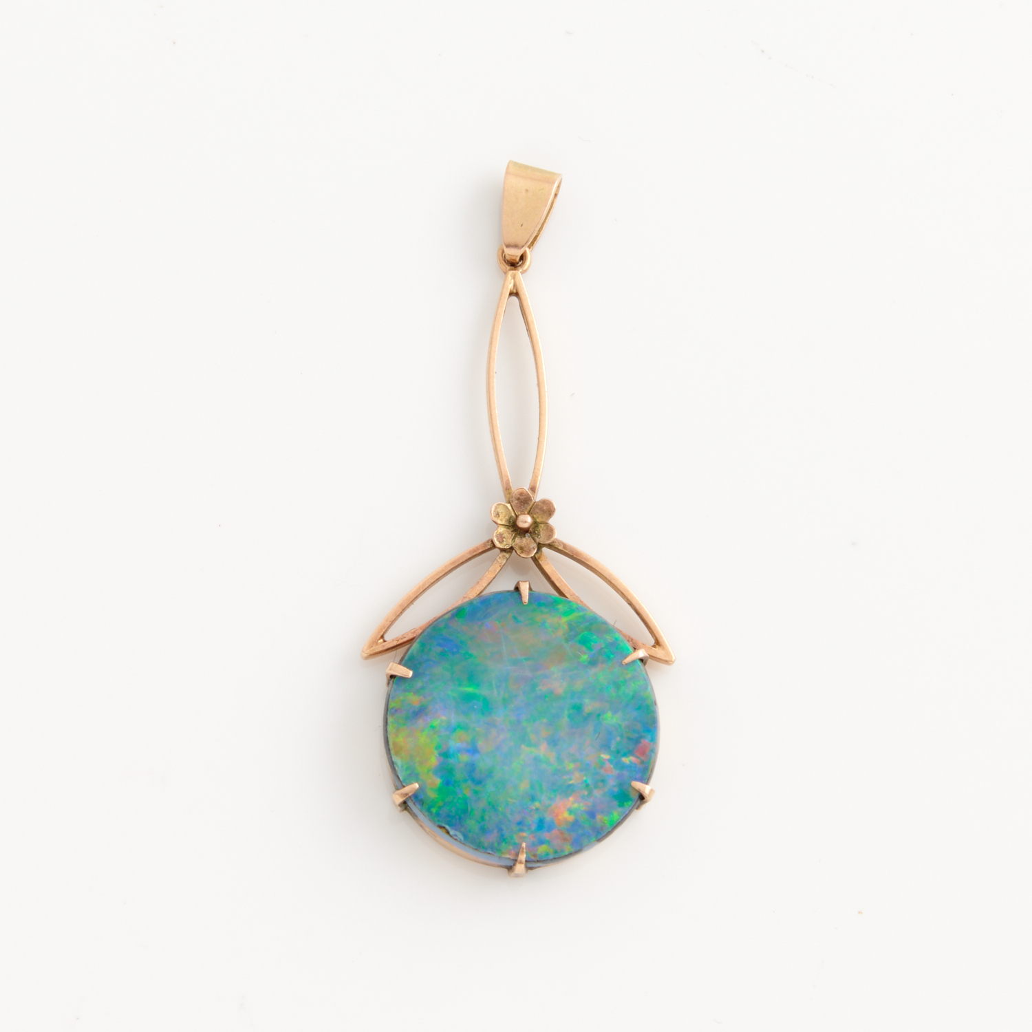 AN OPAL DOUBLET PENDANT IN 9CT GOLD, 40MM X 12MM, 2.1GMS