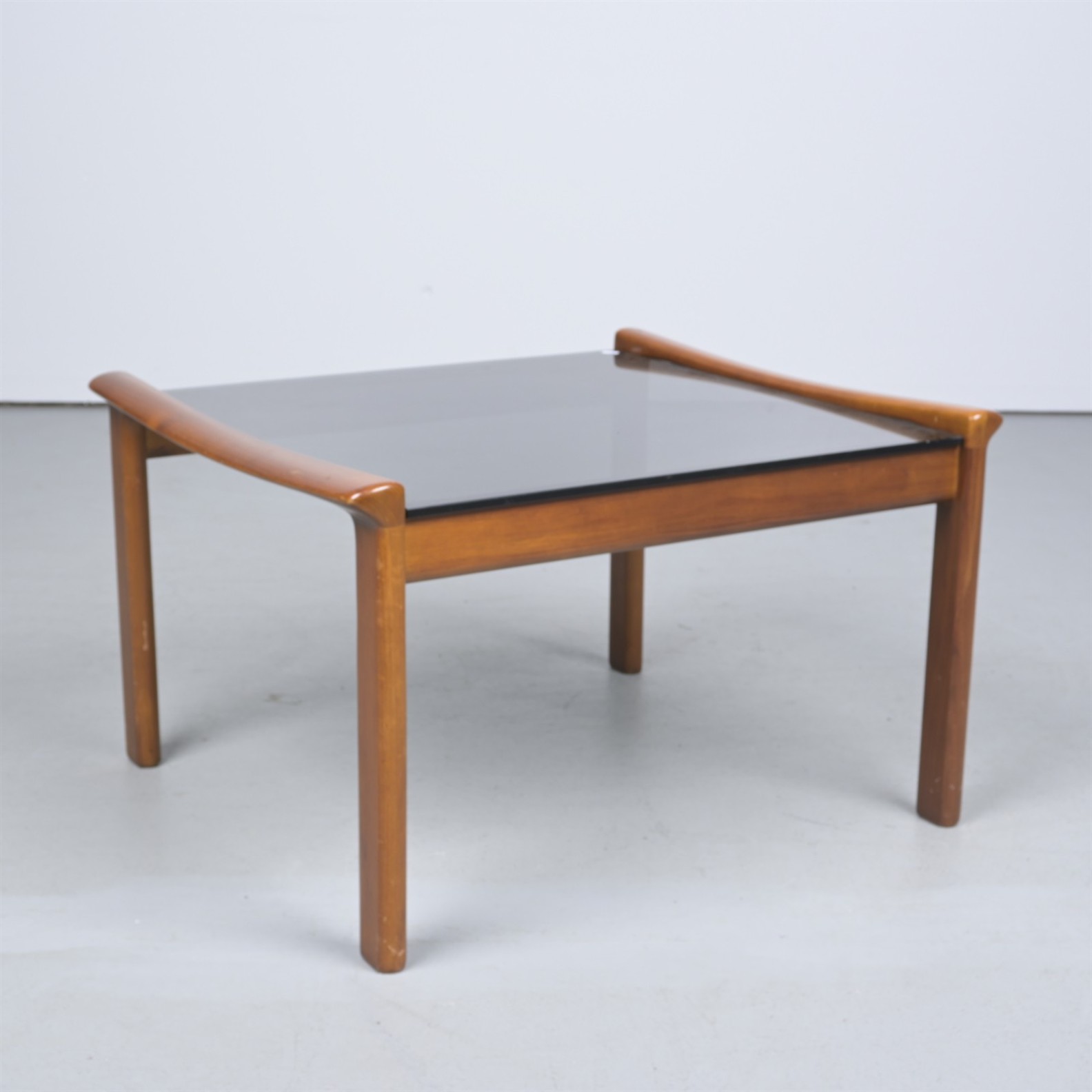 A TESSA TEAK AND SMOKED GLASS COFFEE TABLE (49H X 82W X 71D CM)