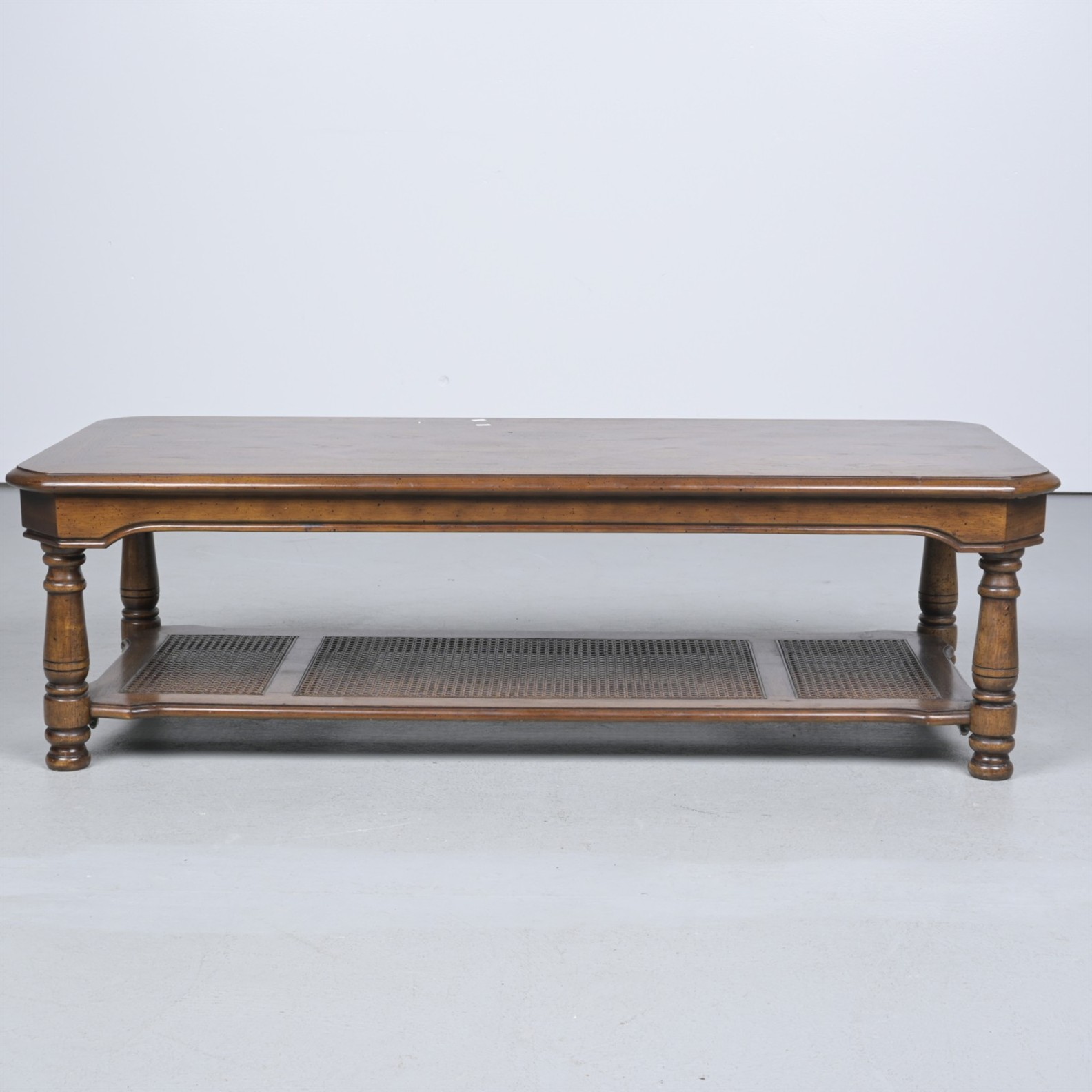 A LOW TABLE IN ANTIQUE MANNER WITH PARQUETRY TOP AND CANED UNDERTIER (42CM H X 143CM W X 61CM D)