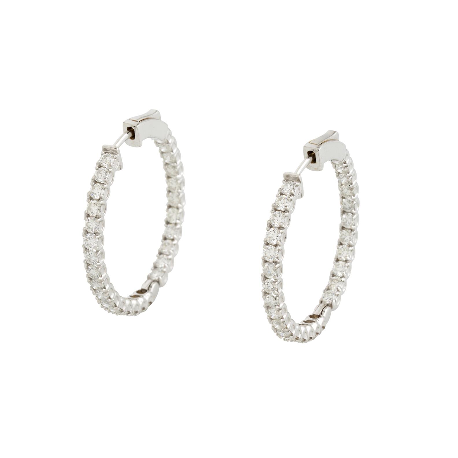 Each circular hoop is claw-set to the front and inside back with a line of brilliant-cut diamonds together weighing approximately 3.85 carats, mounted in 14ct white gold, post fittings, gross weight approximately 8.6 grams.