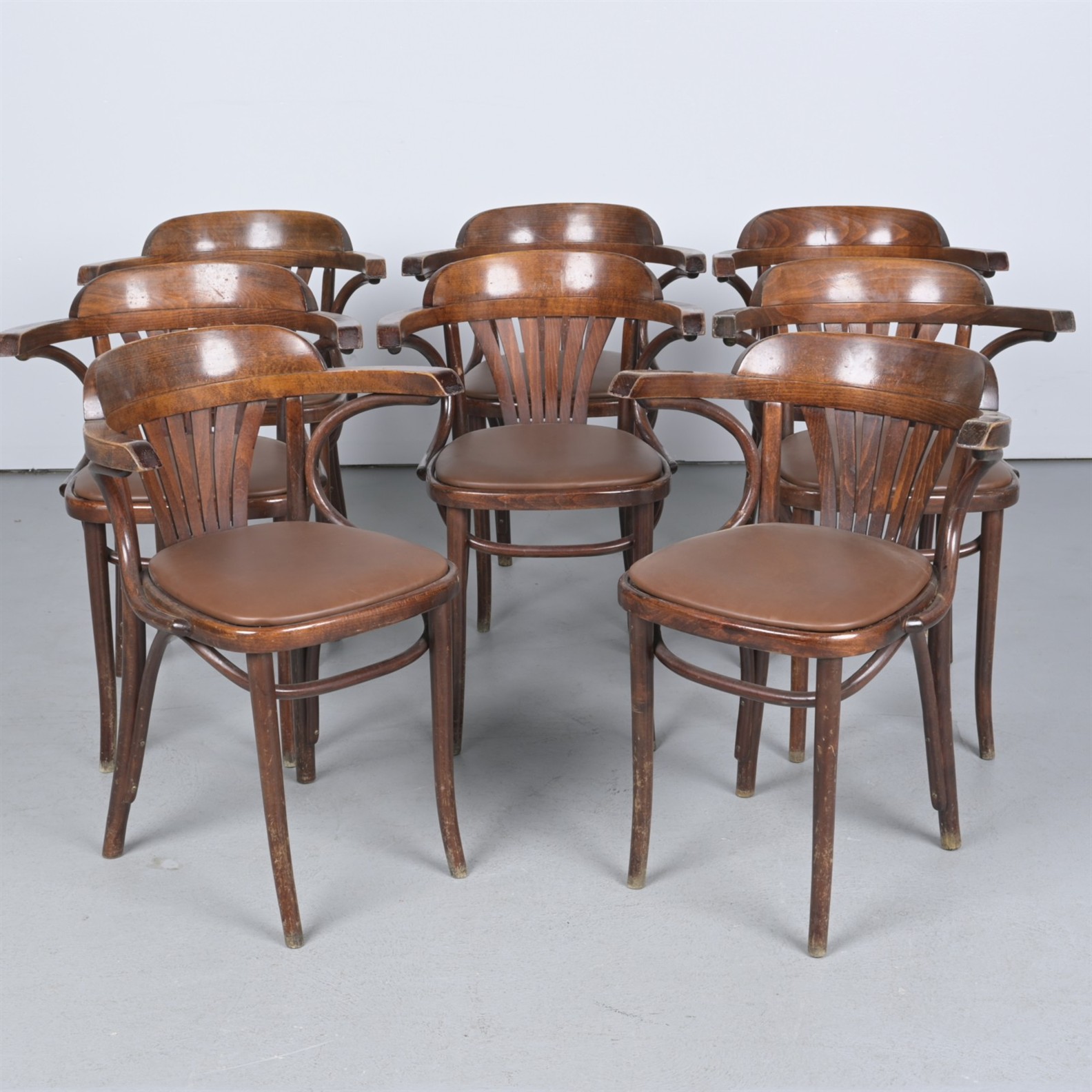 A SET OF EIGHT THONET ELBOW CHAIRS, THE PADDED SEATS IN LEATHER (A/F) (76CM H X 54CM W X 50CM D)