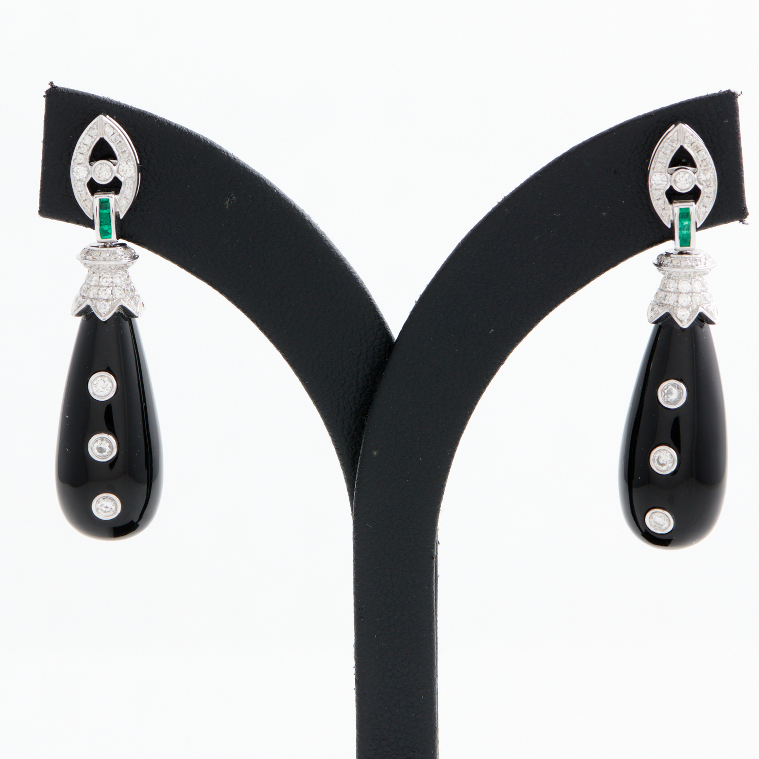 A PAIR OF ONYX AND DIAMOND EARRINGS IN 18CT WHITE GOLD, THE ONYX TOTALLING 40.83CT, THE DIAMOND TOTALLING APPROXIMATELY 1.06CT, 15.33GMS