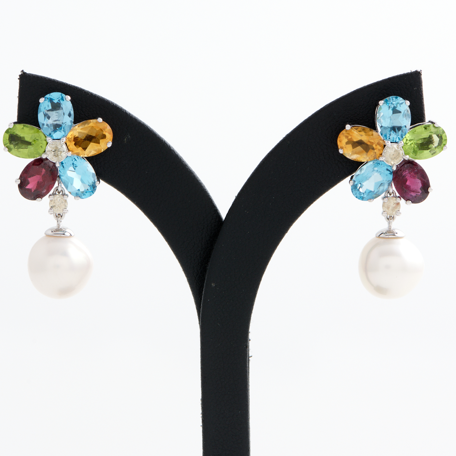 A PAIR OF PEARL, DIAMOND AND MULTI GEM EARRINGS IN 14CT GOLD, THE CITRINE, TOPAZ, PERIDOT AND GARNET TOTALLING 2.31CT, 5.23CT, 2.34CT AND 3.47CT RESPECTIVELY, TOTAL WEIGHT 13.35GMS