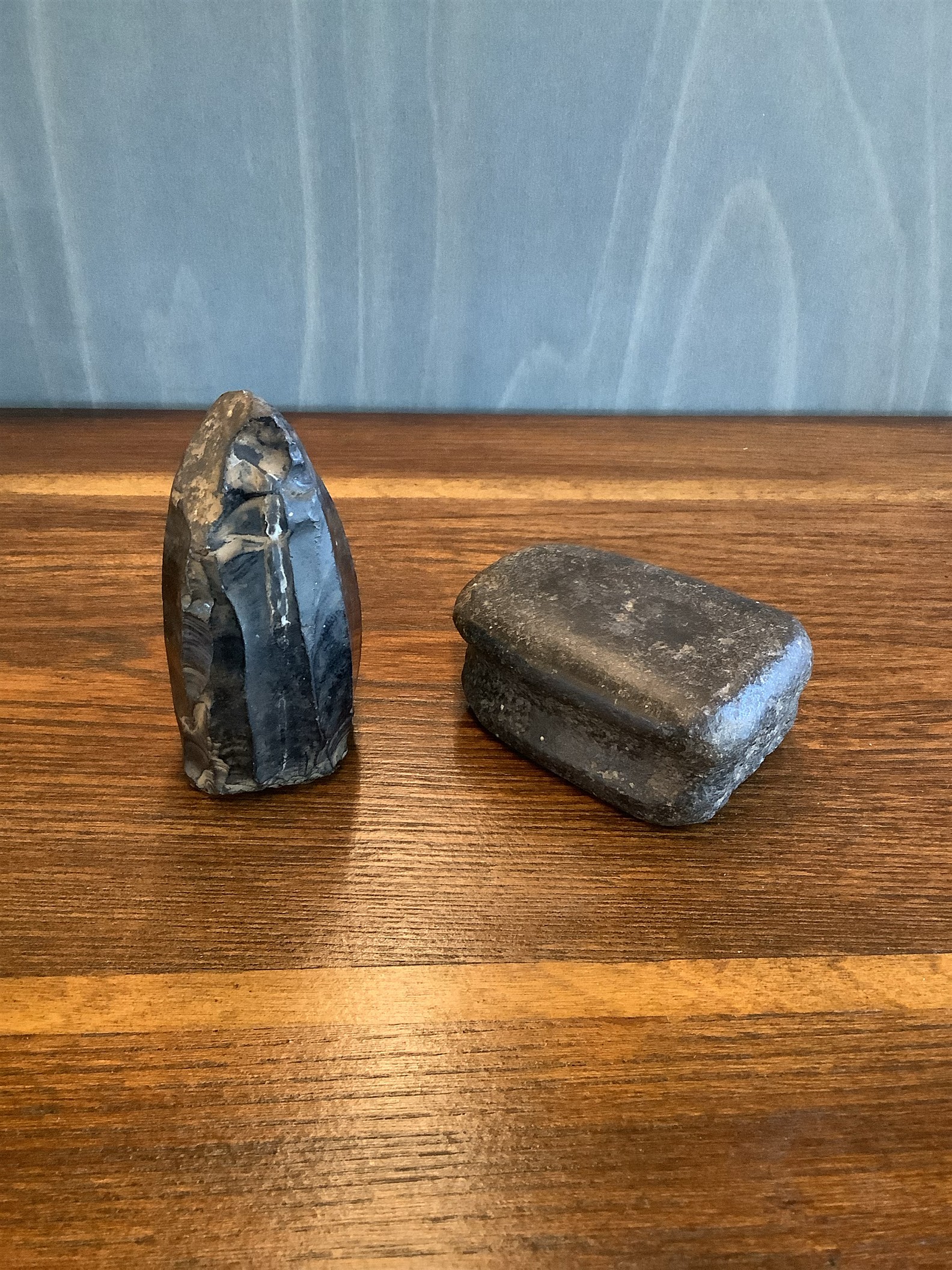 TWO ARCHAIC STONE OBJECTS INCLUDING A POSSIBLE CARBONADO AND A STONE TOOL H.8.5CM (TALLEST)