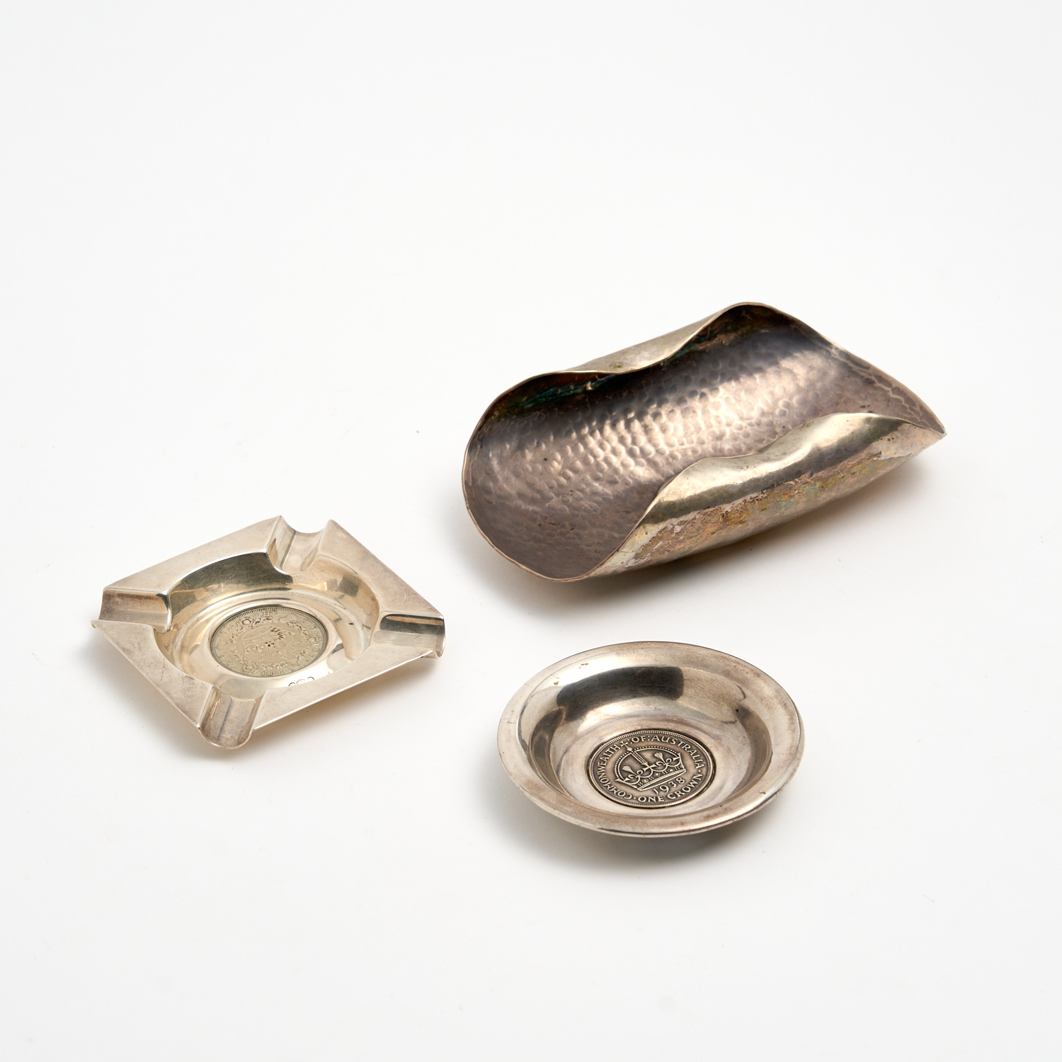 THREE SILVER COIN INSET ASHTRAY/DISHES, ONE MARKED STERLING SILVER, ONE MARKED PERUVIAN 925 SILVER, AND THE THIRD (NO VISIBLE MARKS) WEIGHT OF TWO HALLMARKED PIECES 256G (INCLUDING COIN INSET)