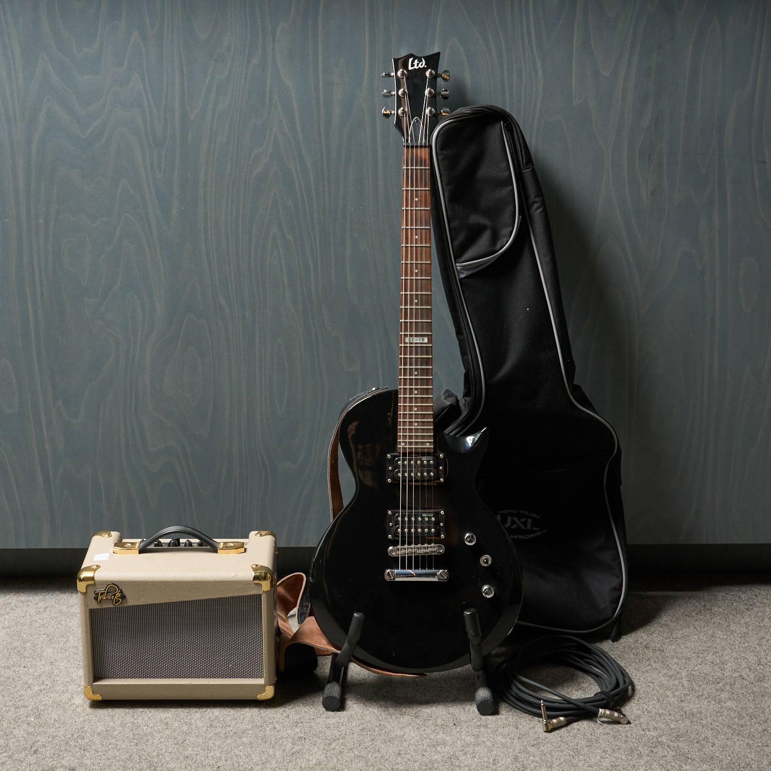 AN ELECTRIC ESP EC-10 GUITAR WITH STAND AND AMP