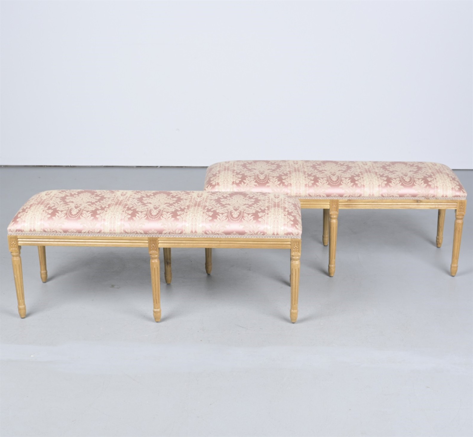A PAIR OF CONTEMPORARY OAK AND UPHOLSTERED LONG STOOLS IN LOUIS XVI MANNER (50CM H X 131CM W X45CM D)