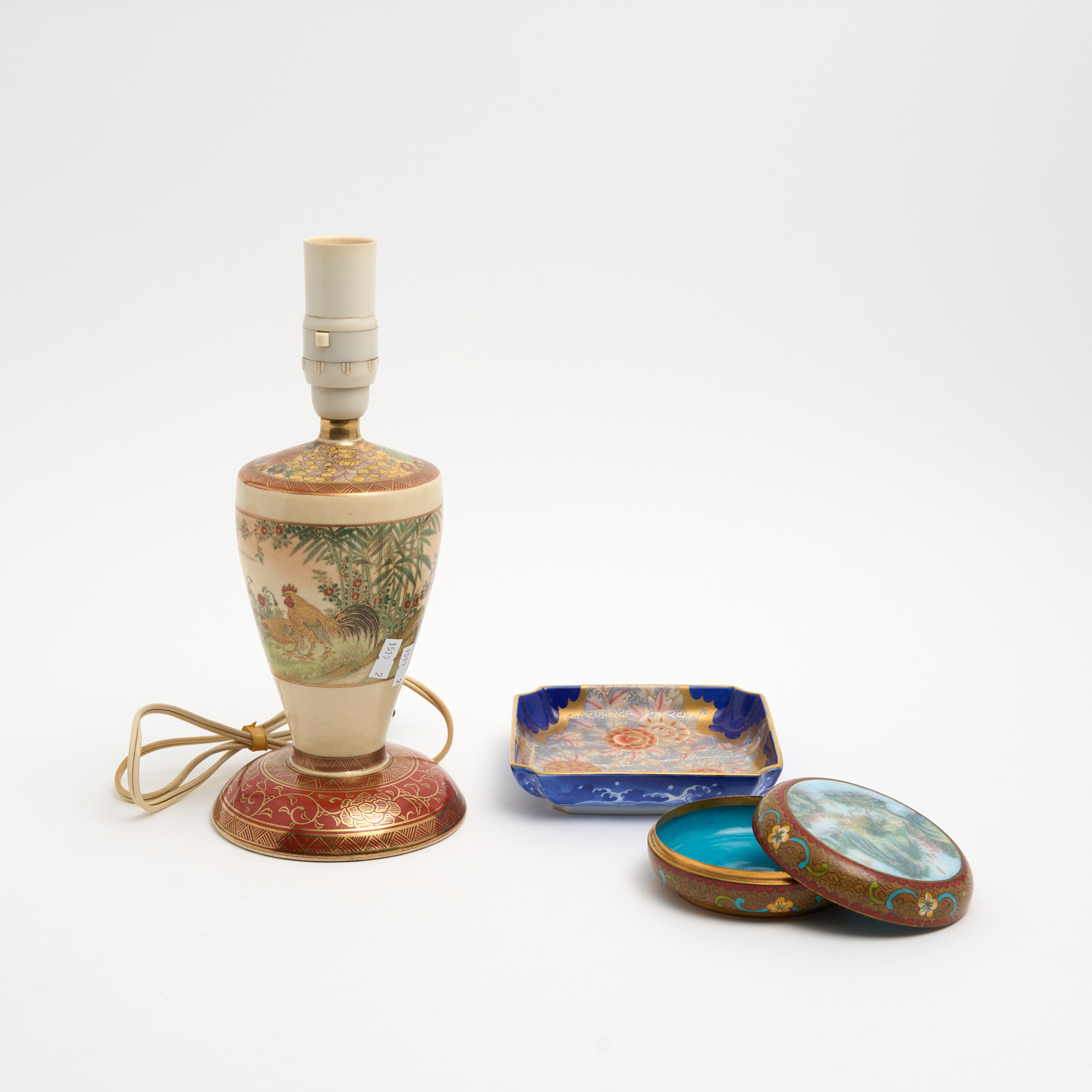 A CLOISONNE LAMP BASE, TOGETHER WITH A CLOISONNE TRINKET BOWL AND A CERAMIC TRINKET DISH H.30CM (TALLEST)