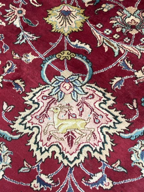 HAND-KNOTTED "KHAYAMI" ATELIER WEAVE FROM THE AZERBAIJAN PROVINCE WITH A UNIQUE DANCING FLOWER DESIGN OF SYMMETRICAL BOLD PALMETTES, PALMETTES CONTAINING GAZELLES & BIRDS OF PARADISE, VASES BEARING FLORAL FOLIAGE AND BOLD TENDRILS IN SHADES OF CHAMPAGNE, BISCUIT, CORNFLOWER BLUE & ROSE SET WITHIN A VIBRANT RUBY RED FIELD. WIDE BORDER OF PALMETTES, GAZELLES & MOUNTAIN LIONS.