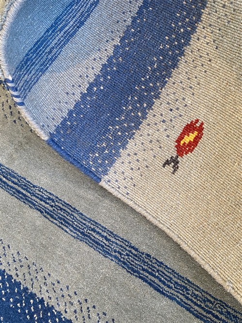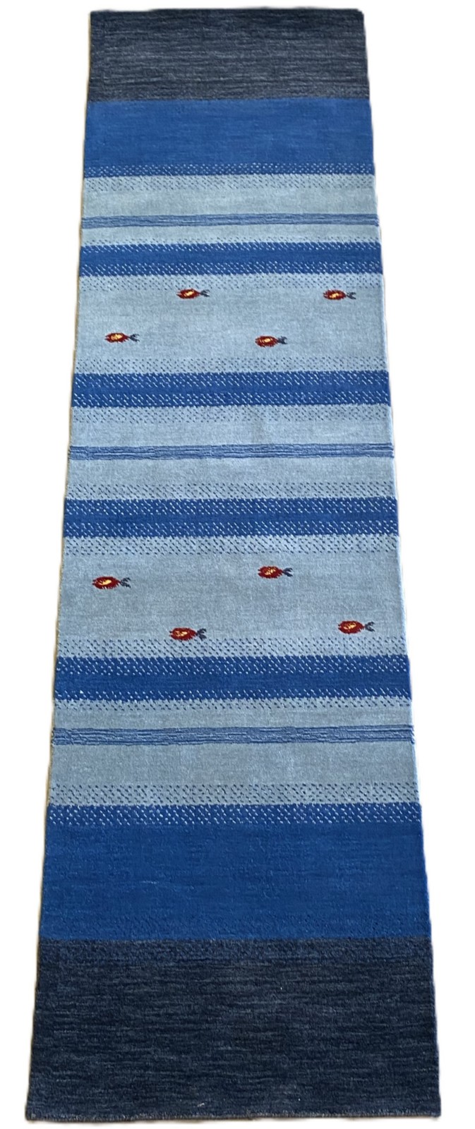 WOOLLEN PILE, HANDMADE LOOM WEAVE WITH NOMADIC PICTORIAL DESIGN OF GOLDFISH SET WITHIN A STRIPED FIELD OF VARYING SHADES OF BLUE.