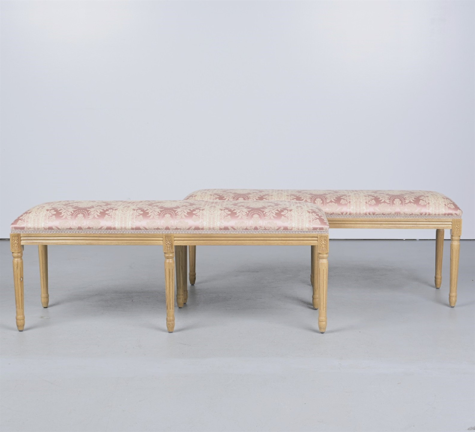 A PAIR OF CONTEMPORARY OAK AND UPHOLSTERED LONG STOOLS IN LOUIS XVI MANNER (50CM H X 131CM W X45CM D)