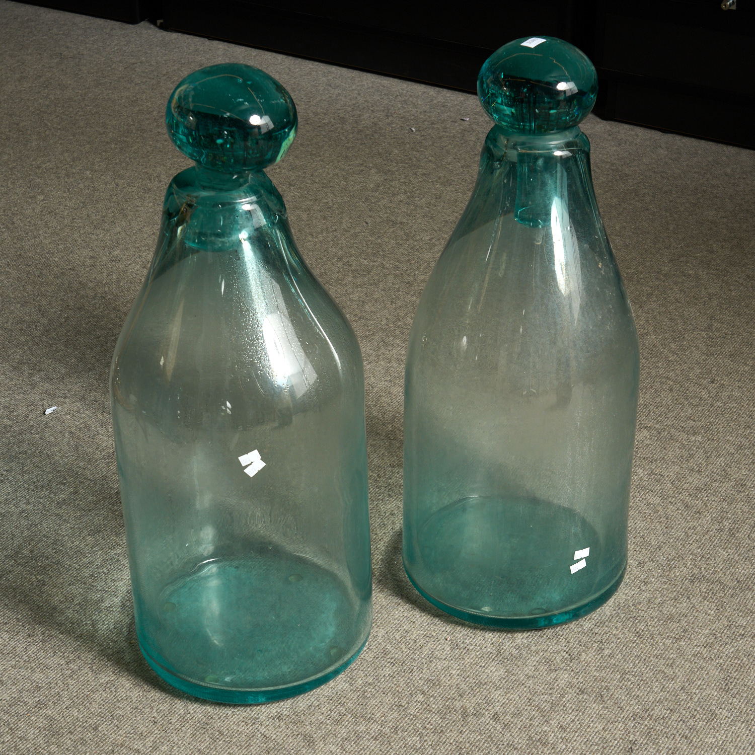 A PAIR OF OVERSIZED GREEN GLASS BOTTLES WITH STOPPERS (A/F CHIPPED) H.72CM