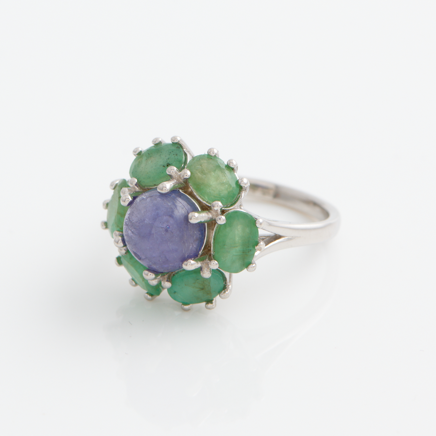 A TANZANITE AND EMERALD RING IN STERLING SILVER, SIZE M 1/2