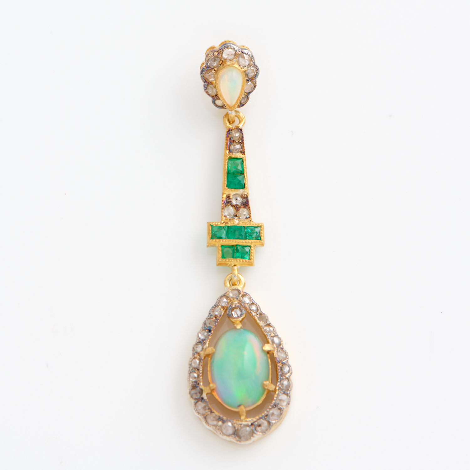 AN OPAL, EMERALD AND DIAMOND PENDANT IN STERLING SILVER AND SILVER GILT, 43MM
