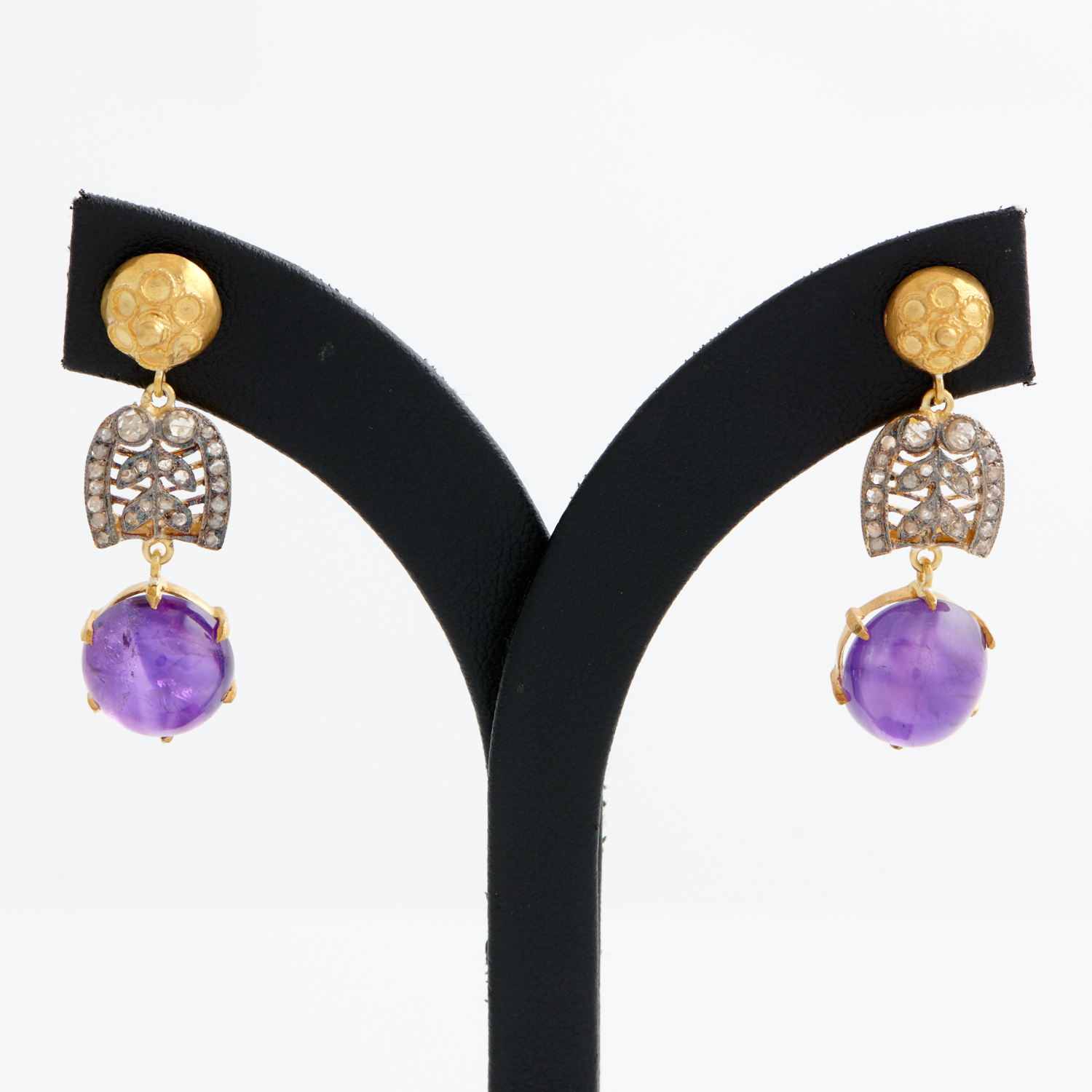 A PAIR OF AMETHYST AND DIAMOND EARRINGS IN STERLING SILVER AND SILVER GILT, TO POST AND BUTTERFLY FITTINGS, 35MM