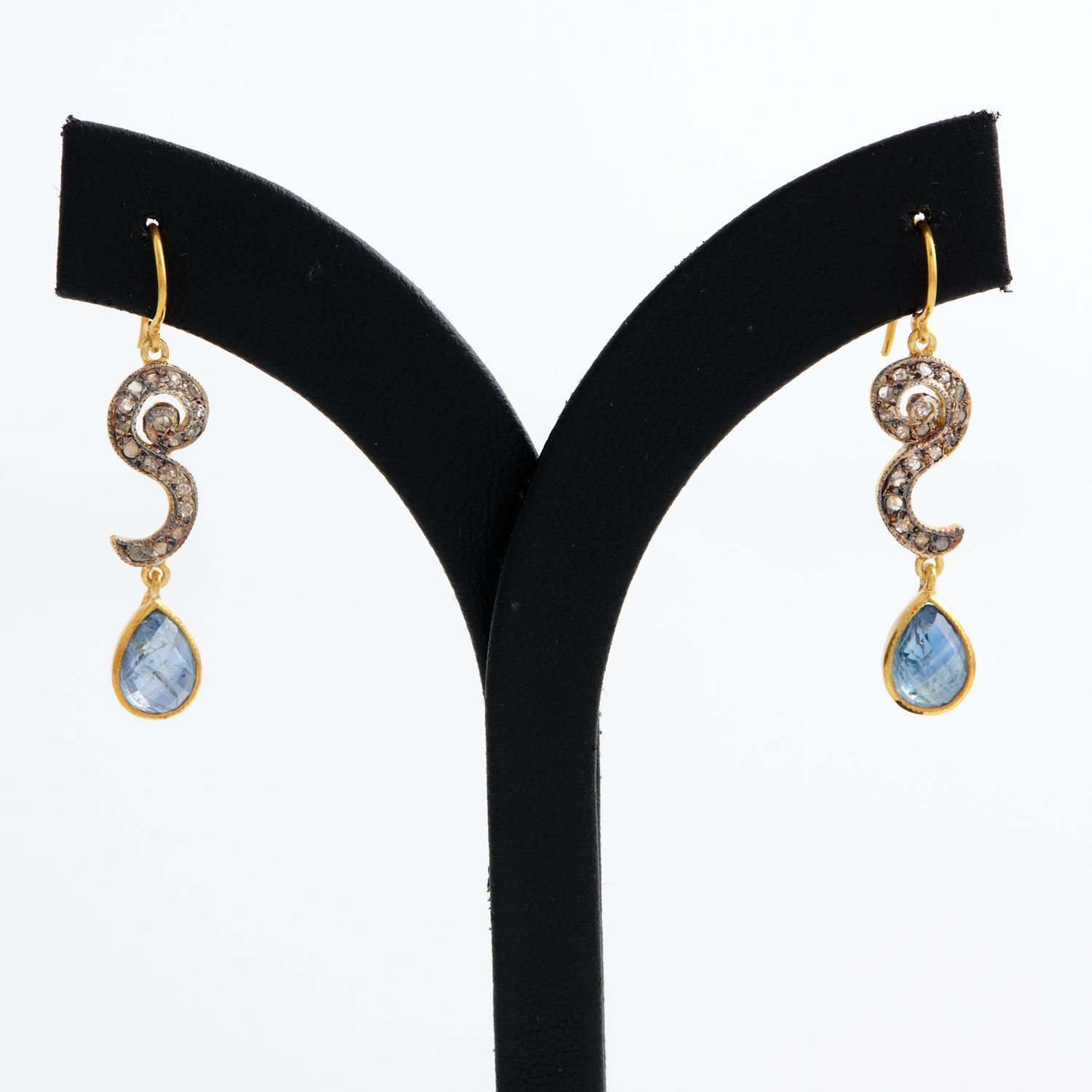 A PAIR OF SAPPHIRE AND DIAMOND EARRINGS IN STERLING SILVER AND SILVER GILT, TO SHEPHERD HOOK FITTINGS, DROP LENGTH 35MM