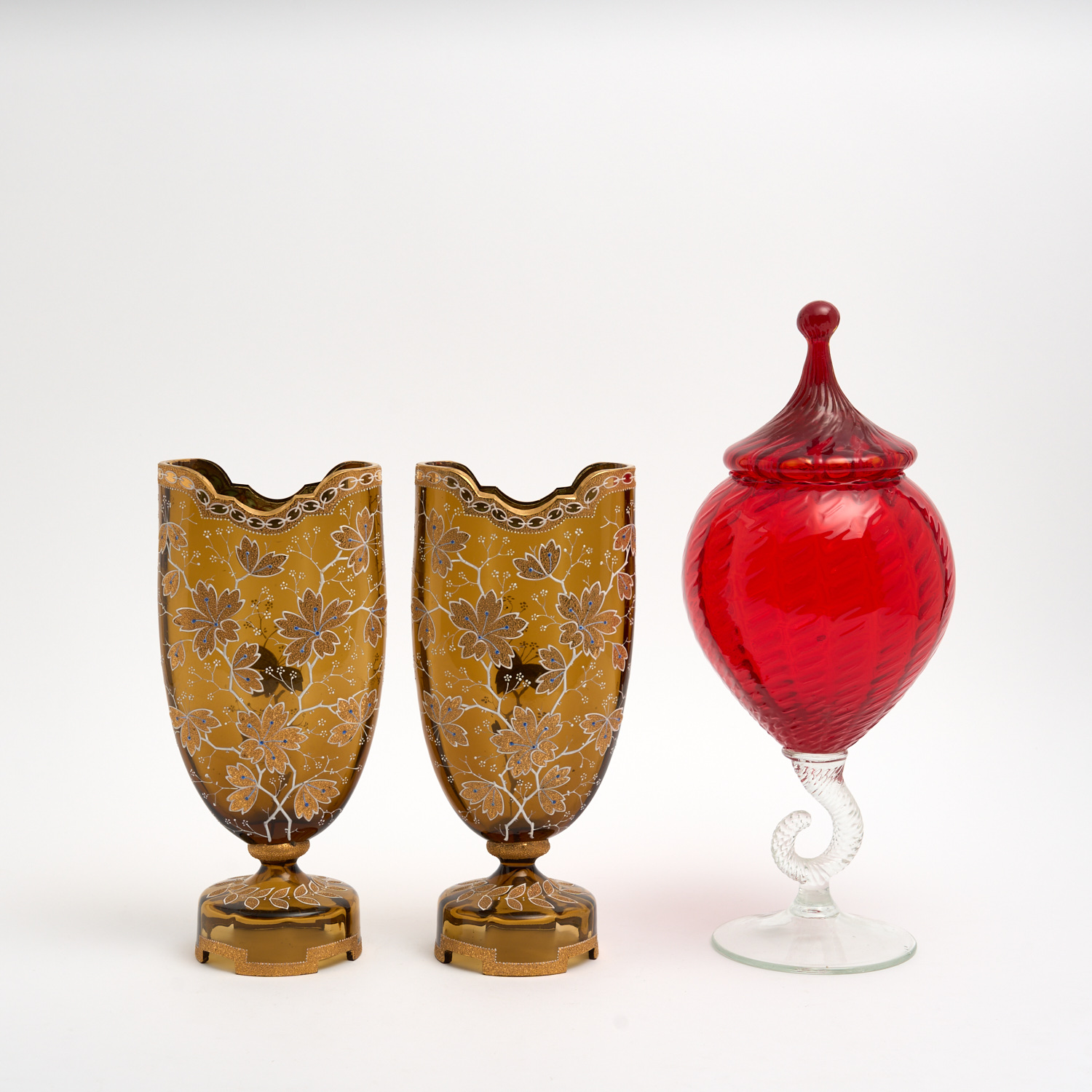 A PAIR OF ENAMELLED BOHEMIAN GLASS VASES, TOGETHER WITH A RED GLASS MURANO LIDDED BOWL