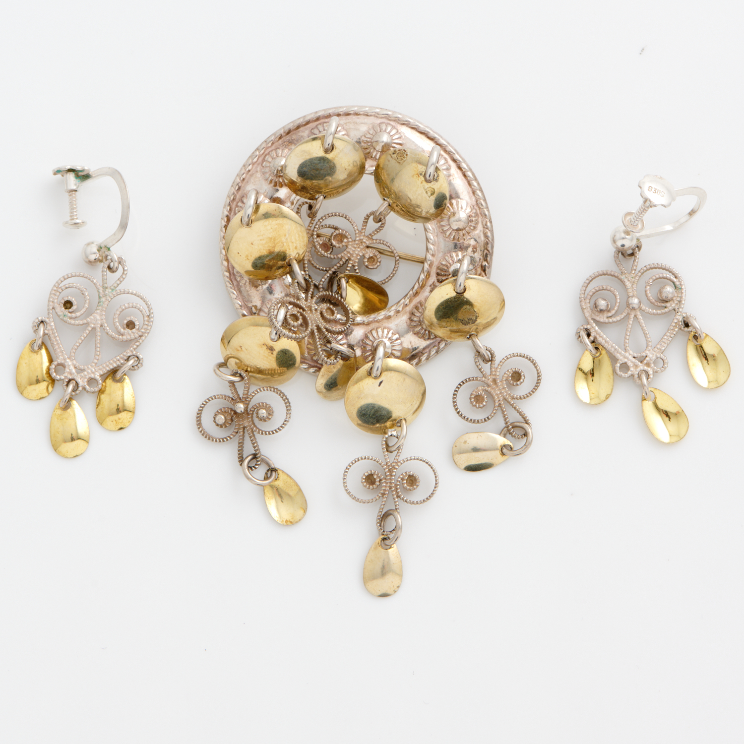 AN OPENWORK BROOCH IN SILVER 60MM X 36MM, TOGETHER WITH A PAIR OF EARRINGS IN SILVER TO POST AND SCREWBACK FITTINGS, 30MM