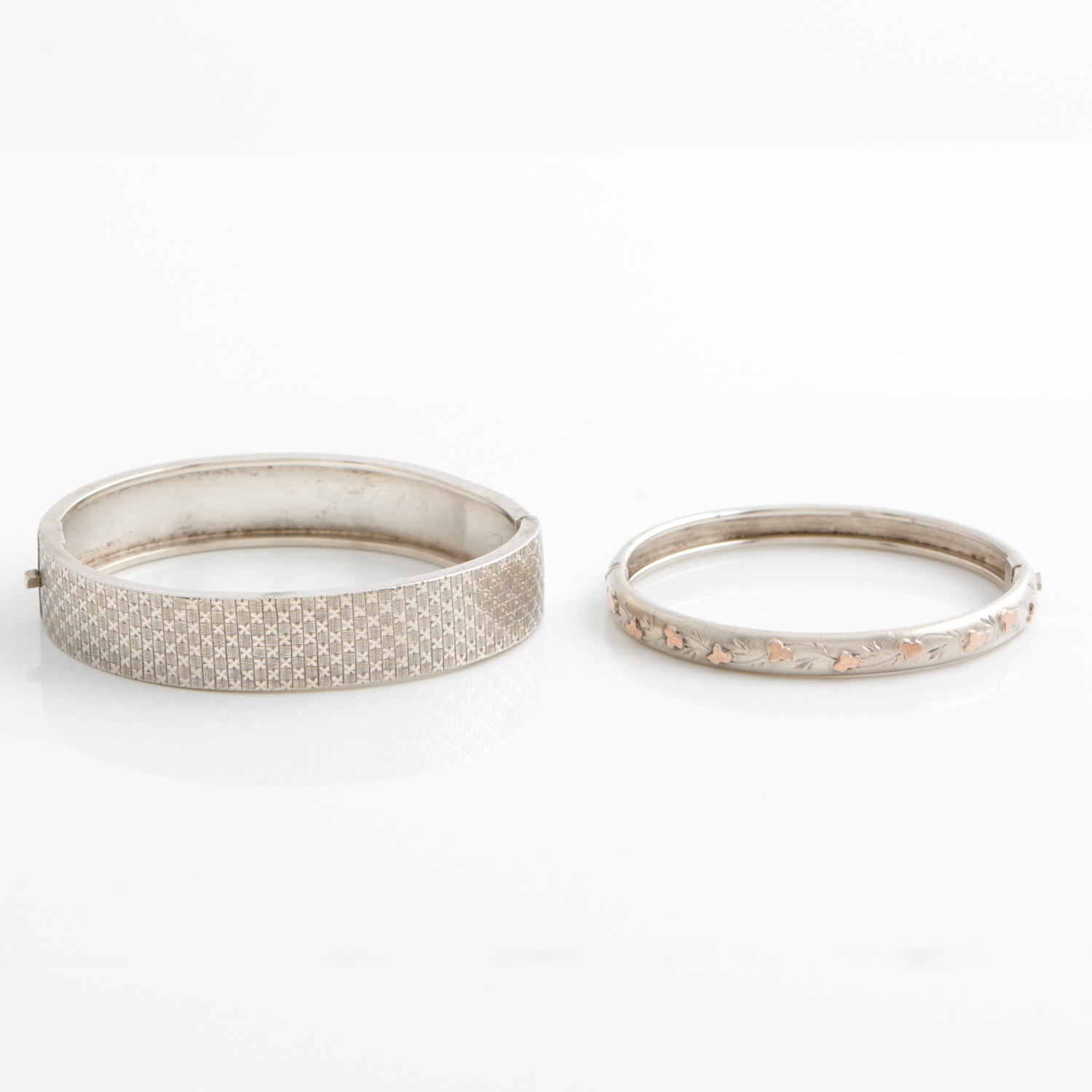 A PAIR OF BANGLES IN SILVER, INNER DIAMETER OF LARGEST BANGLE 60MM, INNER DIAMETER OF SMALL BANGLE 50MM