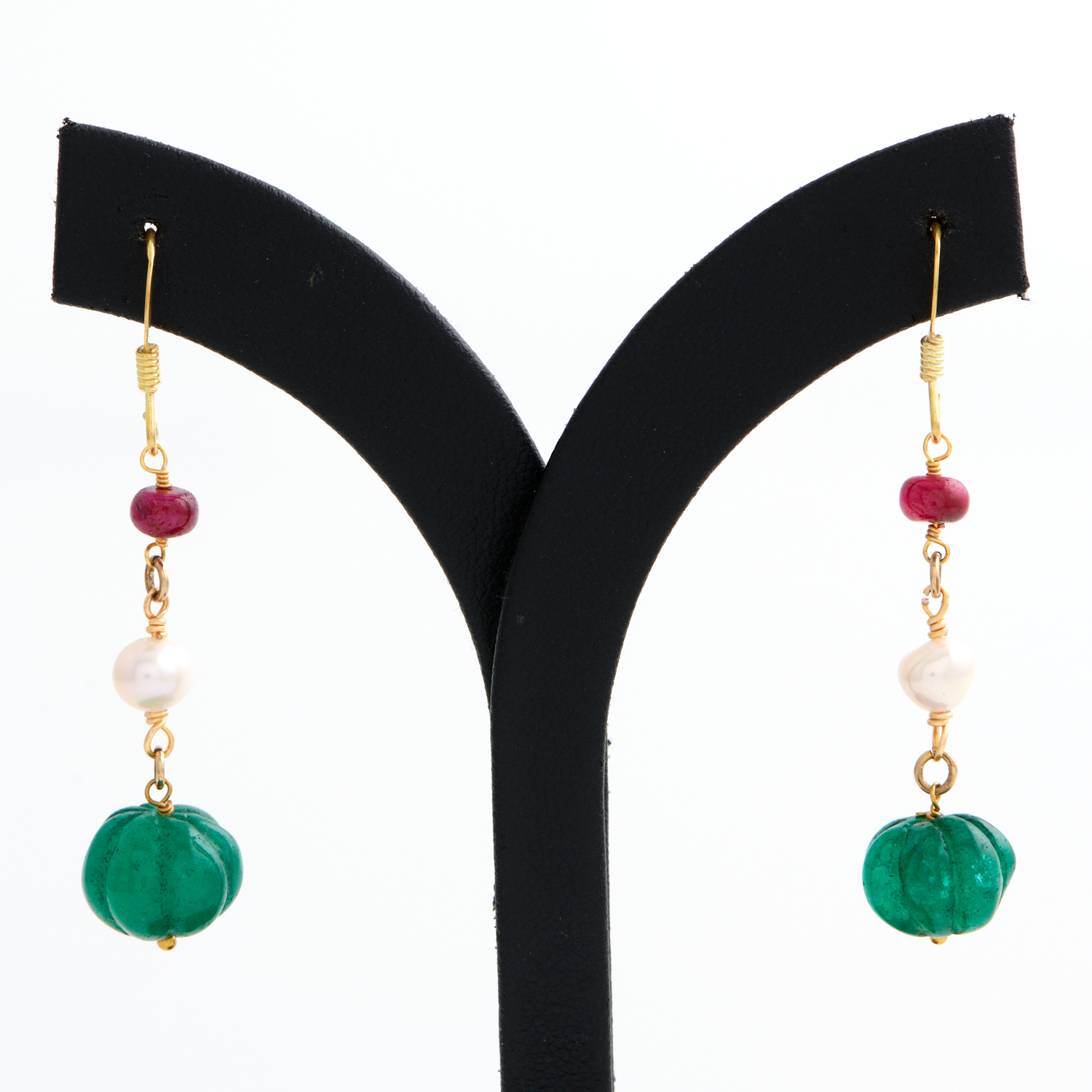 A PAIR OF EMERALD, RUBY AND PEARL EARRINGS IN SILVER GILT, TO SHEPHERD HOOK FITTINGS, 45MM