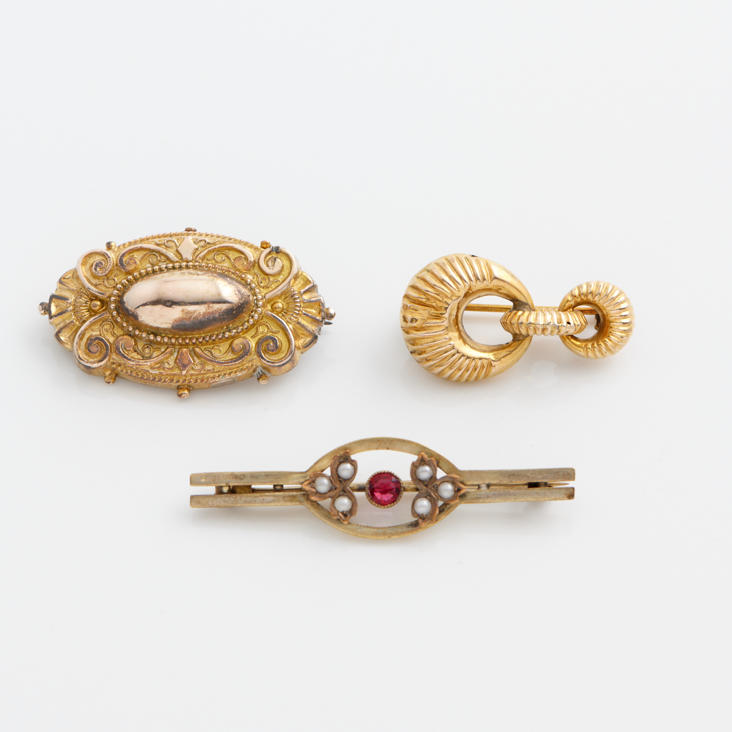 A TRIO OF ANTIQUE BROOCHES IN GOLD PLATE, THE LARGEST MEASURING 50MM