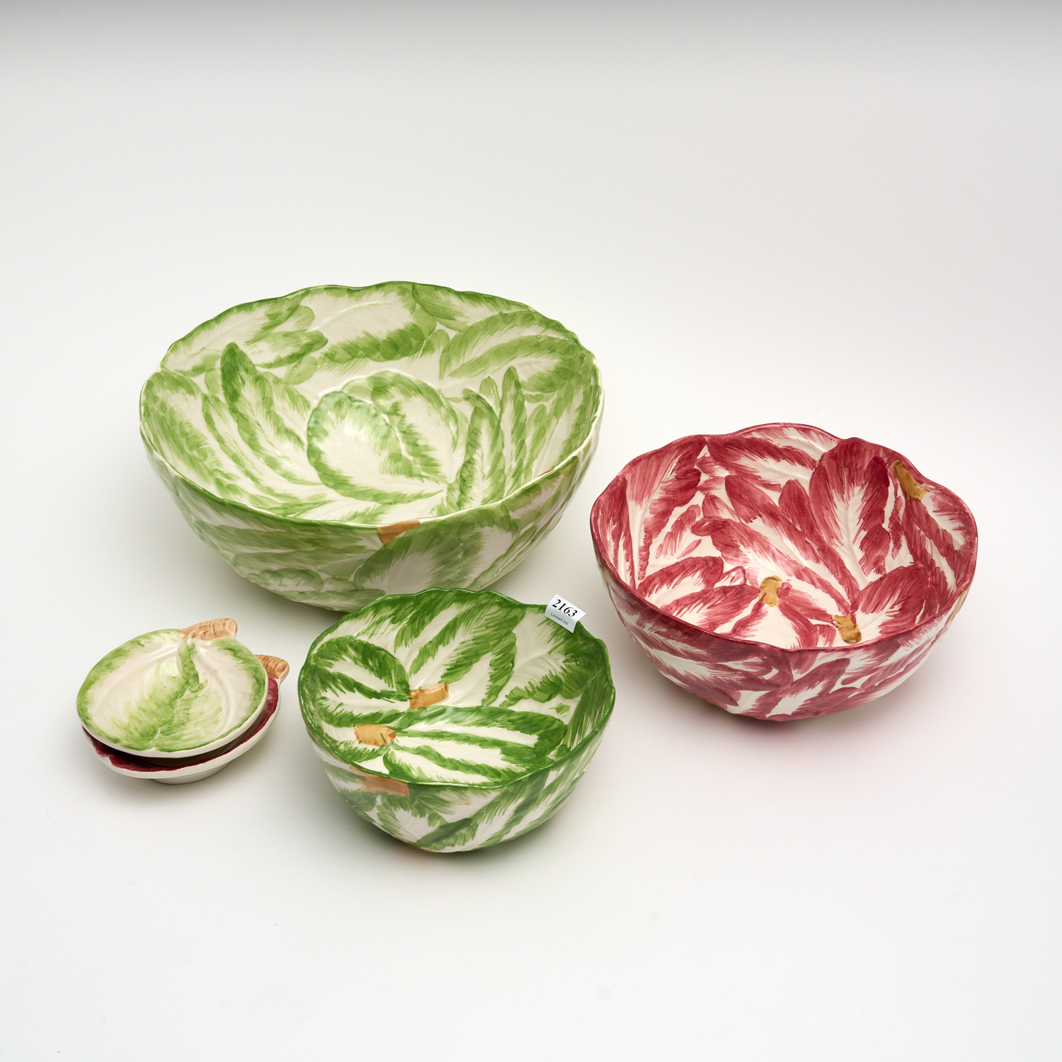 A COLLECTION OF FIVE PIECES OF ITALIAN HAND PAINTED CABBAGE LEAF FORM SERVING BOWLS AND DISHES DIA.33CM (LARGEST)