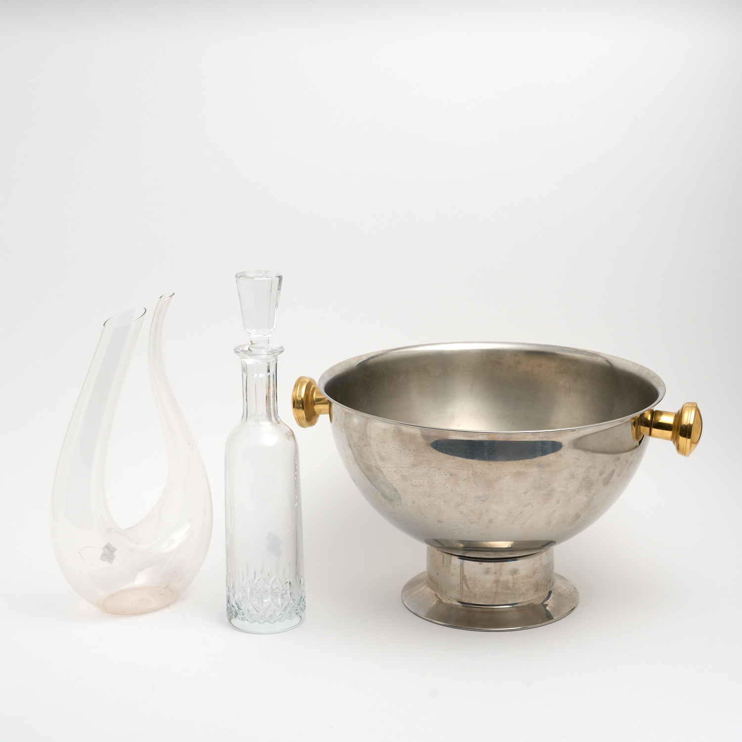 AN OVERSIZED SILVERPLATE ICE BUCKET TOGETHER WITH TWO DECANTERS INCLUDING A LARGE REIDEL DECANTER AND A CRYSTAL DECANTER DIA.38CM