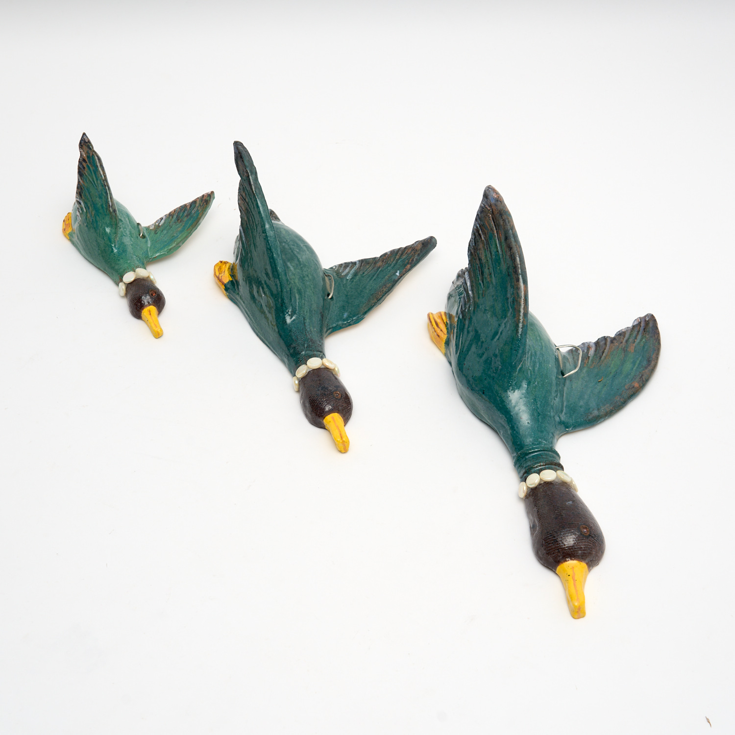 A SET OF THREE VINTAGE AUSTRALIAN POTTERY FLYING DUCKS L.30CM (LARGEST)
