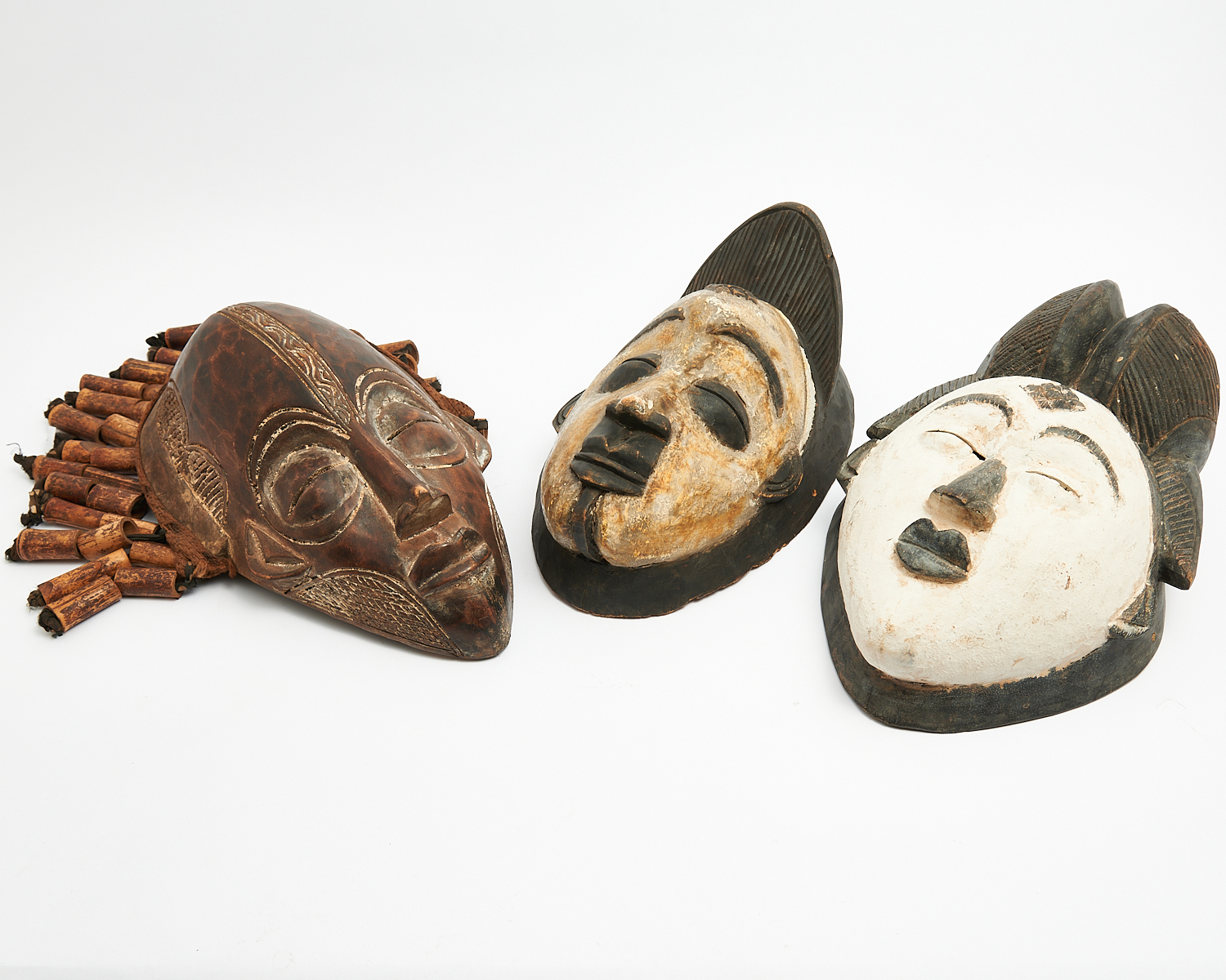 THREE AFRICAN CARVED MASKS, TWO FROM THE GABONESE REPUBLIC H.39CM (LARGEST),