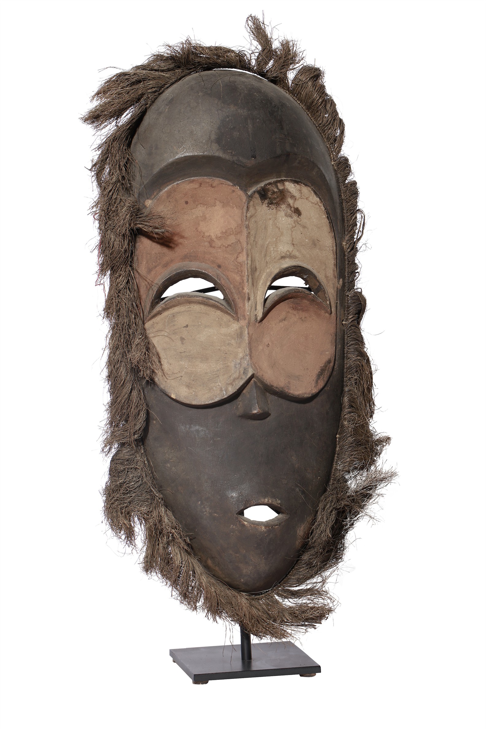 A NEW GUINEA CARVED AND POLYCHROME WOOD TRIBAL MASK, SEPIK RVER, FRINGED WITH COCONUT HUSK DECORATION H.45CM
