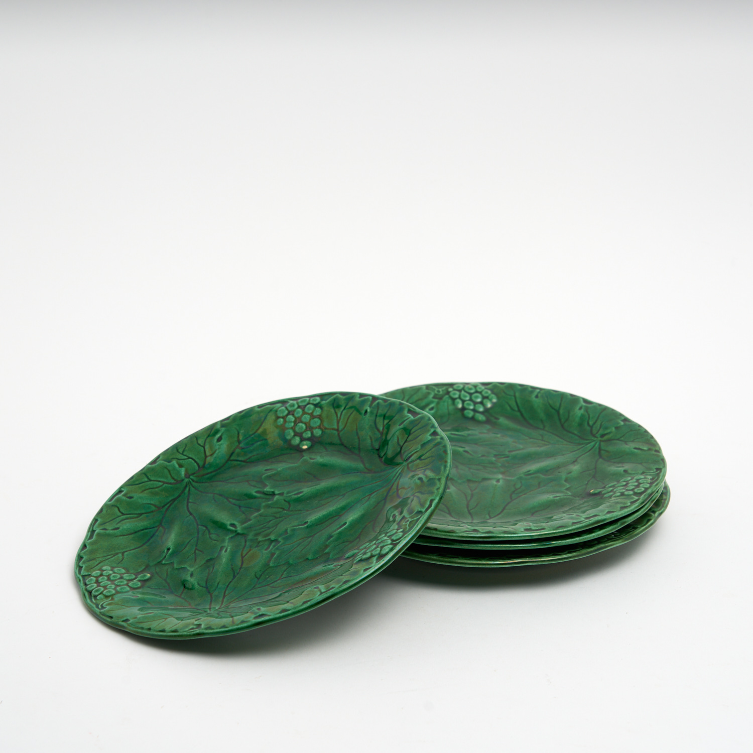A SET OF FOUR CONTINENTAL GREEN MAJOLICA LEAF DECORATED PLATES DIA.20CM