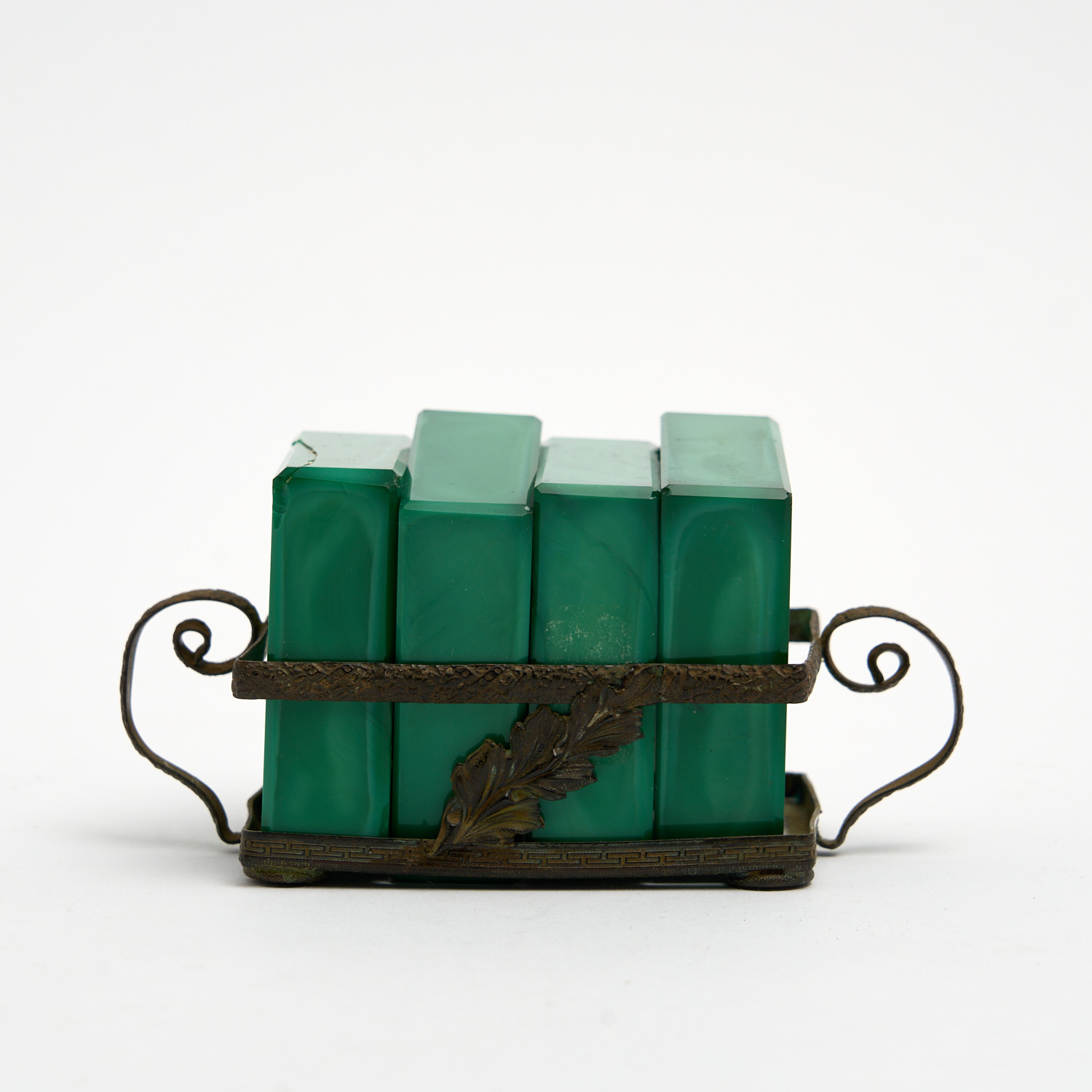 A SET OF FOUR CZECH ART DECO MALACHITE GLASS DISHES (A/F) 14CM