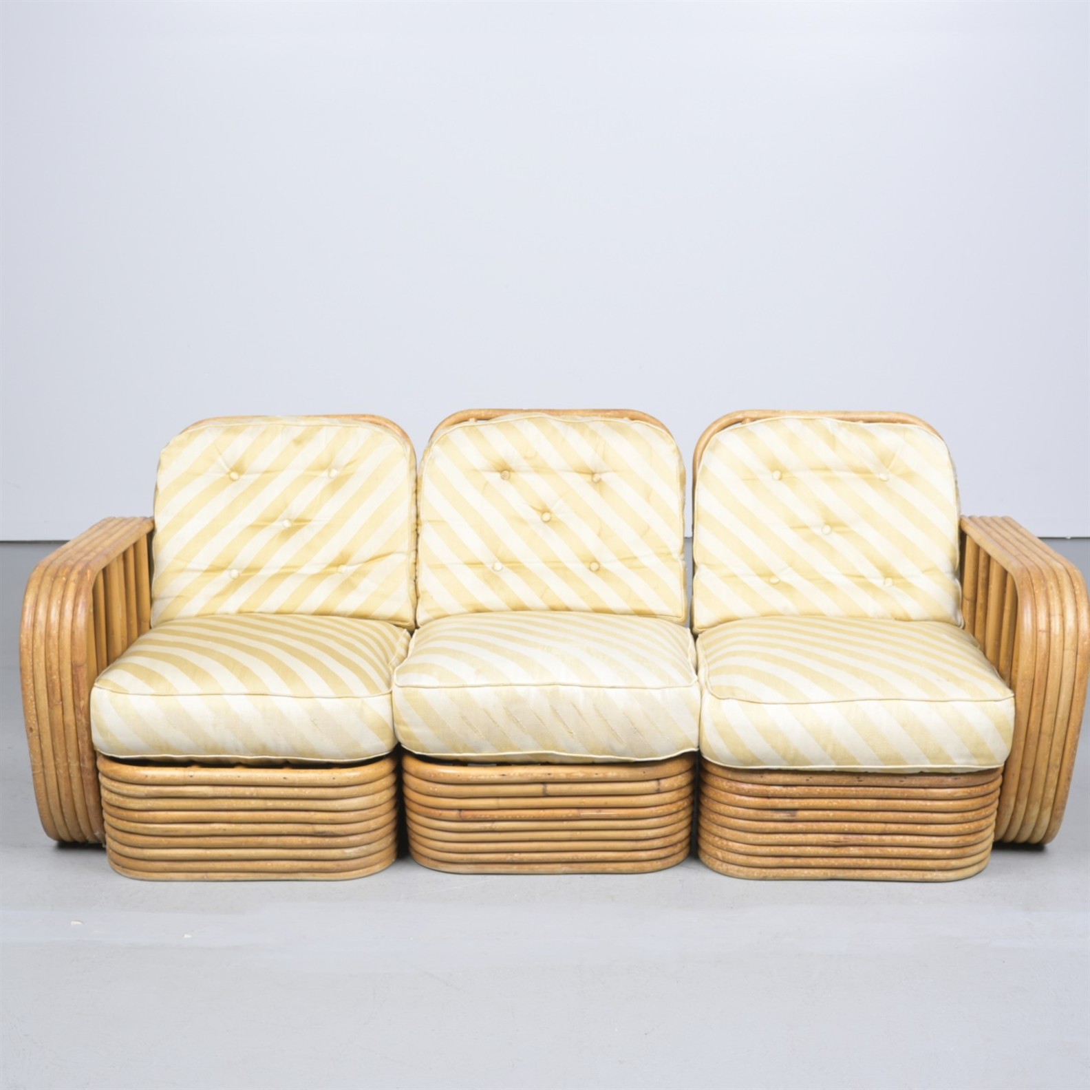 A MID-20th CENTURY CANE THREE-SEAT SOFA (72H X 196W X 95D CM) (THIS ITEM MUST BE REMOVED BY PROFESSIONAL CARRIERS OR CLIENTS. LEONARD JOEL STAFF CANNOT ASSIST WITH CARRYING OR DELIVERY OF THIS ITEM)